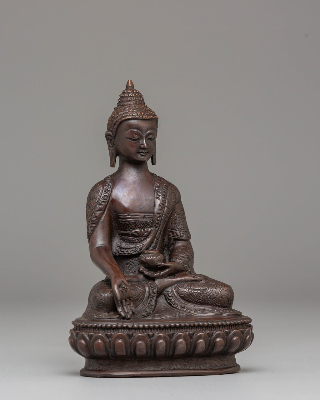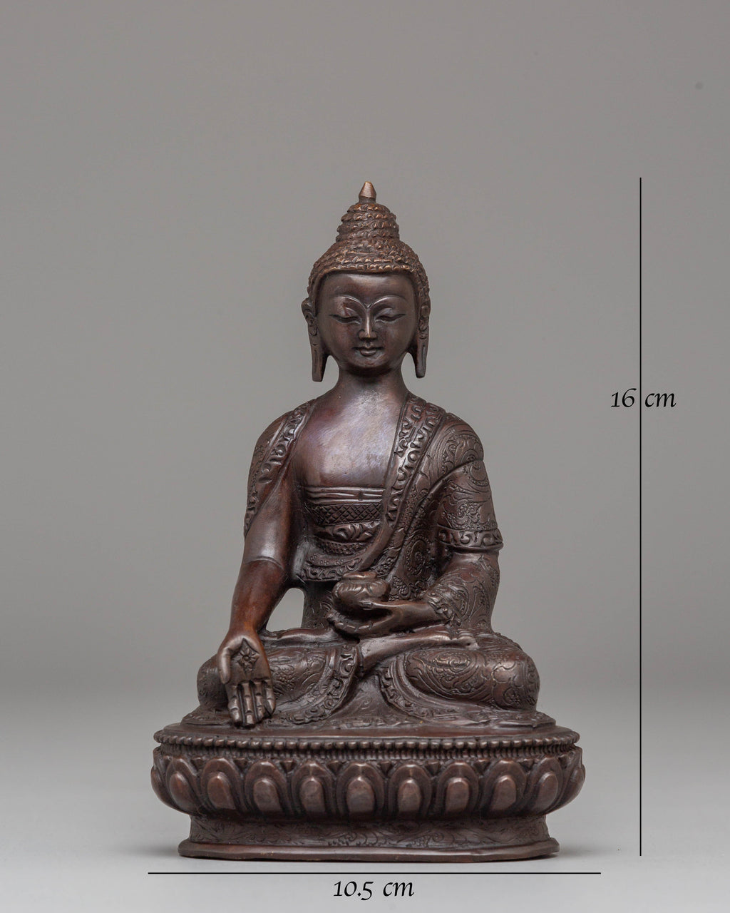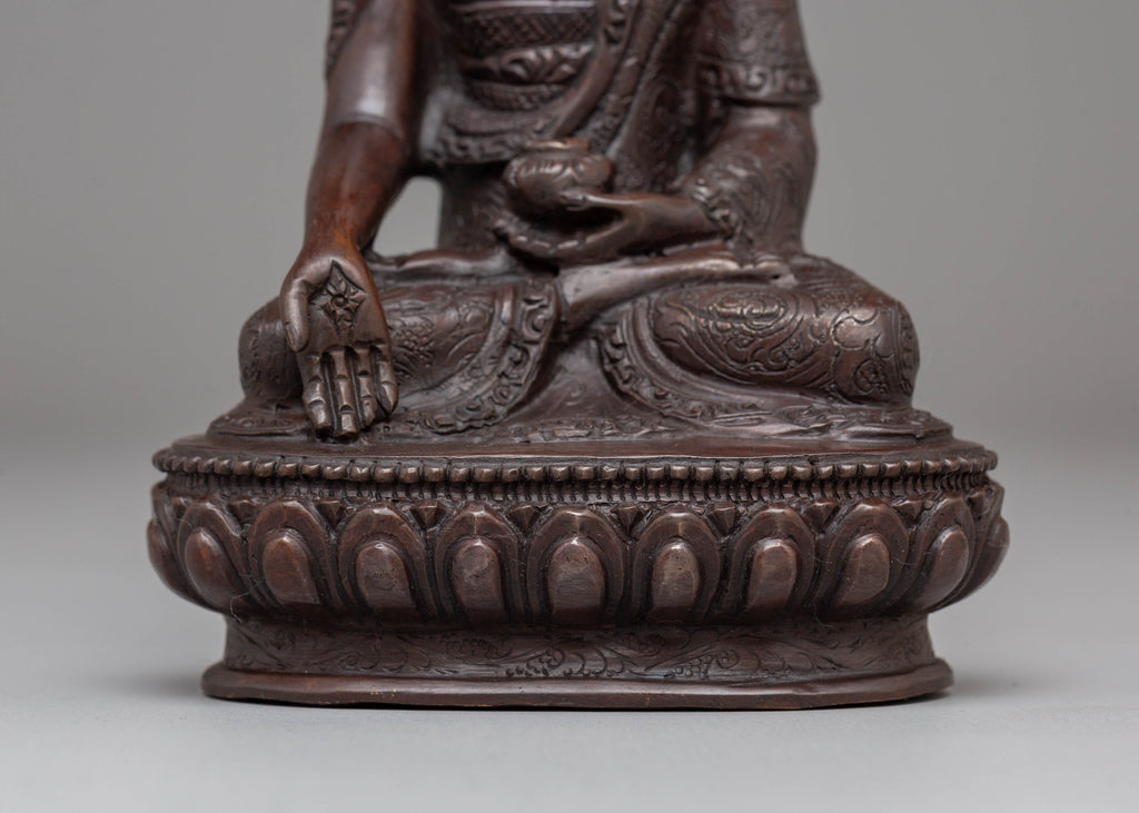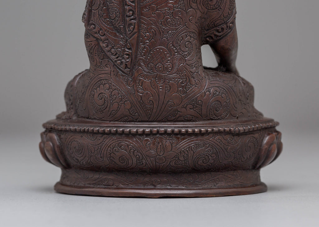 This Peaceful Jewel-born Buddha Ratnasambhara statue measures 16 cm in height and 10.5 cm at the base, weighing 0.61 kg. Crafted from oxidized copper, this statue represents Ratnasambhara, the Buddha of wealth and prosperity. Known for bestowing riches and good fortune, Ratnasambhara is revered for his compassionate nature and ability to grant material abundance and spiritual blessings. Expertly handcrafted by skilled artisans, this statue is a beautiful addition to altars, meditation areas, or sacred spaces, inviting prosperity and peace into your home or practice.