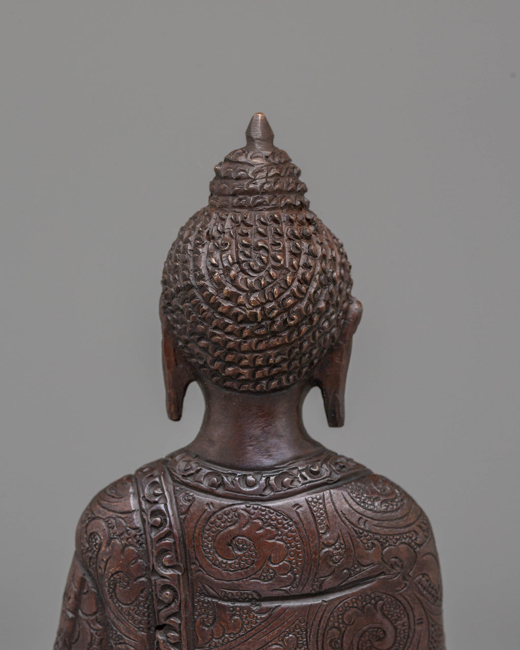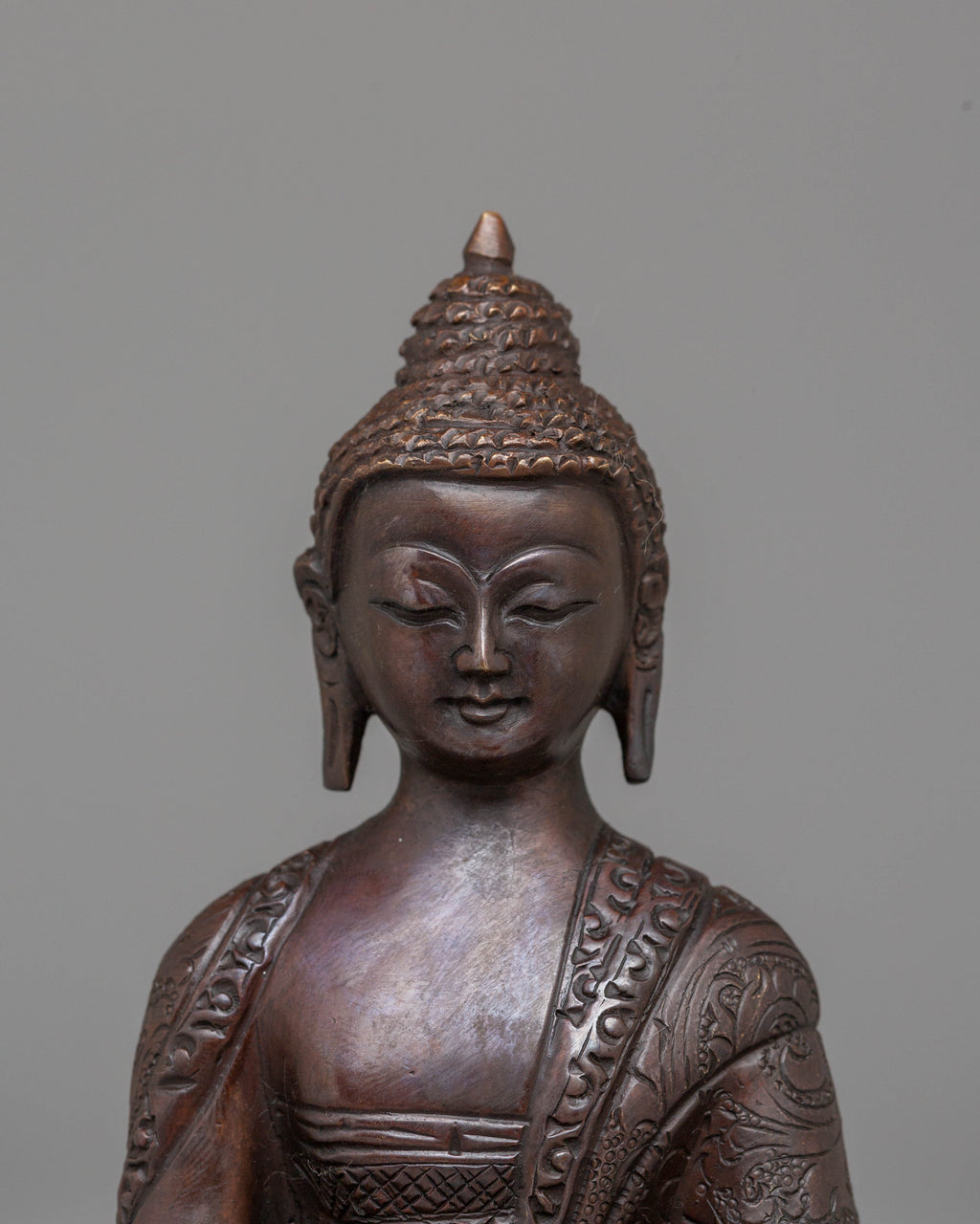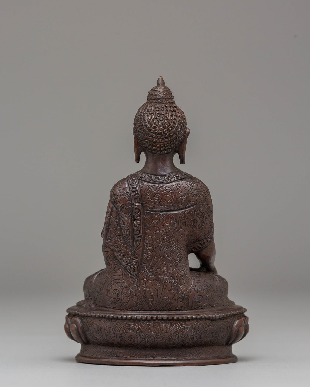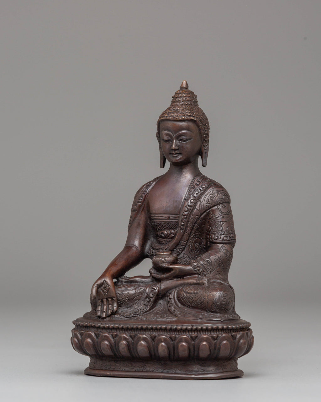 This Peaceful Jewel-born Buddha Ratnasambhara statue measures 16 cm in height and 10.5 cm at the base, weighing 0.61 kg. Crafted from oxidized copper, this statue represents Ratnasambhara, the Buddha of wealth and prosperity. Known for bestowing riches and good fortune, Ratnasambhara is revered for his compassionate nature and ability to grant material abundance and spiritual blessings. Expertly handcrafted by skilled artisans, this statue is a beautiful addition to altars, meditation areas, or sacred spaces, inviting prosperity and peace into your home or practice.