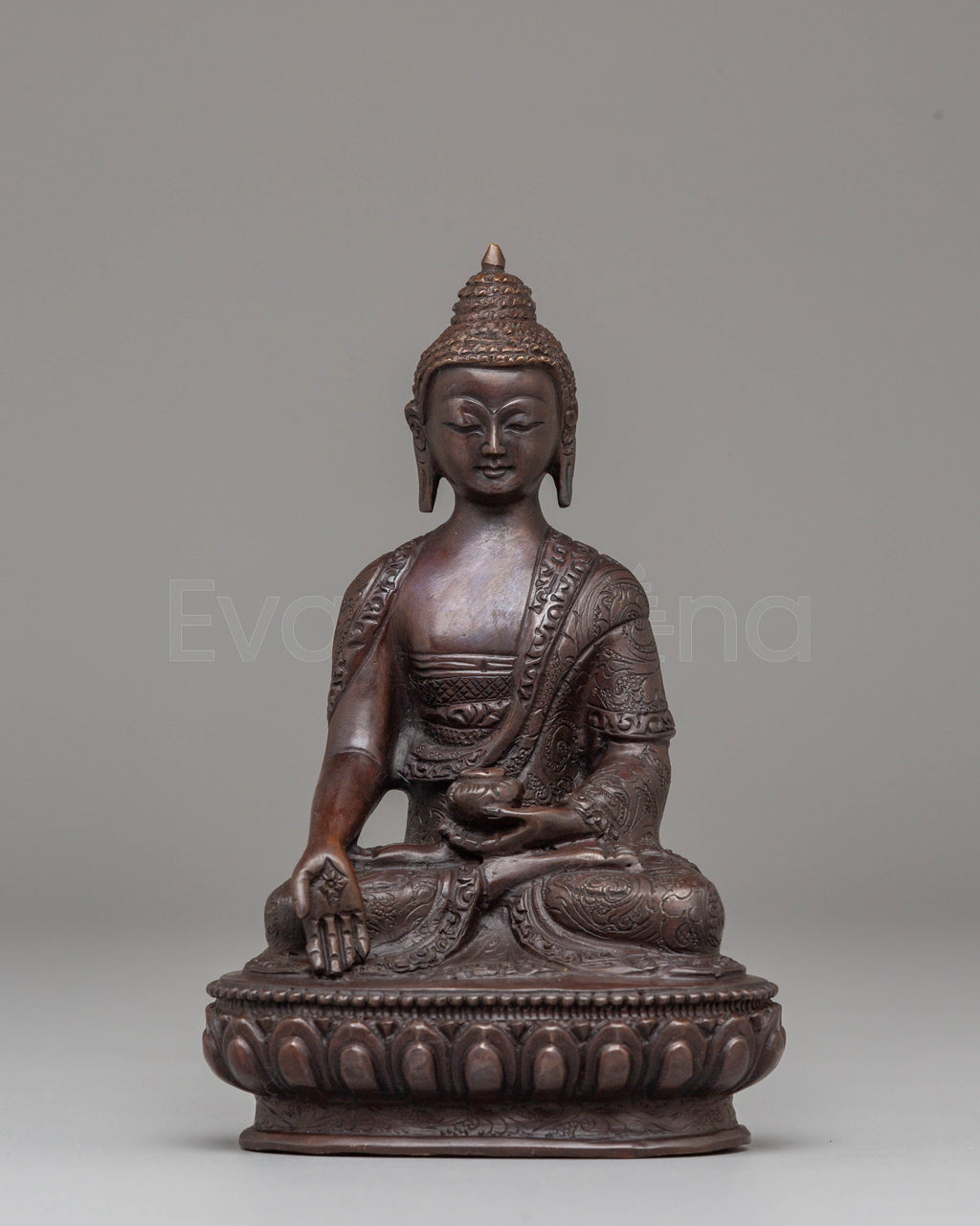 The statue of Ratnasambhara features an ushnisha atop his head, symbolizing enlightened wisdom. He performs the varada mudra, a gesture representing generosity and the granting of blessings. In his right hand, he holds an alms bowl, which signifies compassion and the act of providing sustenance. Adorned with large earrings and dressed in a monastic robe, he sits peacefully in vajrasana (diamond posture) on a moon-disc lotus base, symbolizing purity and spiritual awakening.