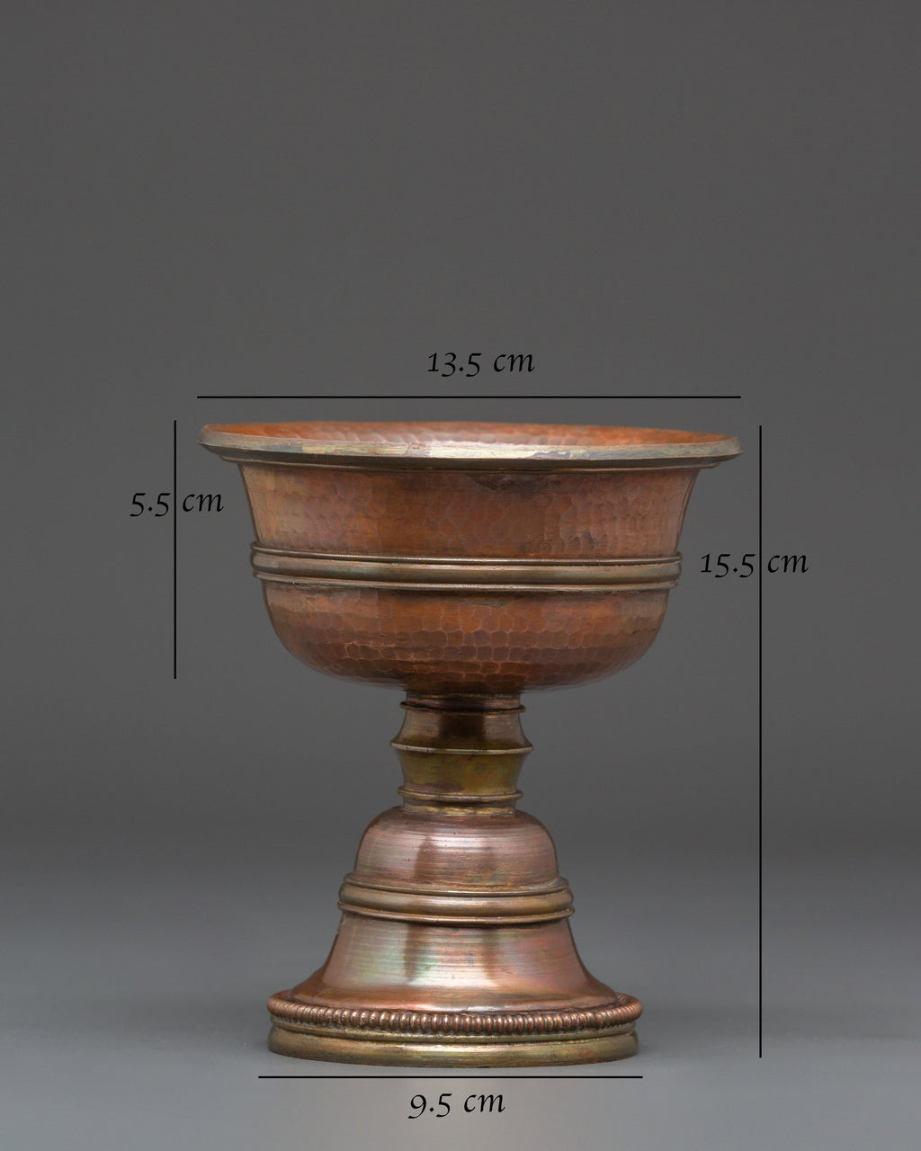 This Oxidized Copper Oil Lamp is a beautifully handcrafted ritual lamp used in Tibetan Buddhist offerings and meditation practices. Standing 15.5cm high with a 13.5cm diameter and weighing 0.77kg, it features a sturdy 9.5cm base and a 5.5cm inner depth designed to hold oil or butter. Its oxidized finish gives it a aesthetic, making it both a sacred ritual tool and a meaningful piece of Himalayan craftsmanship.