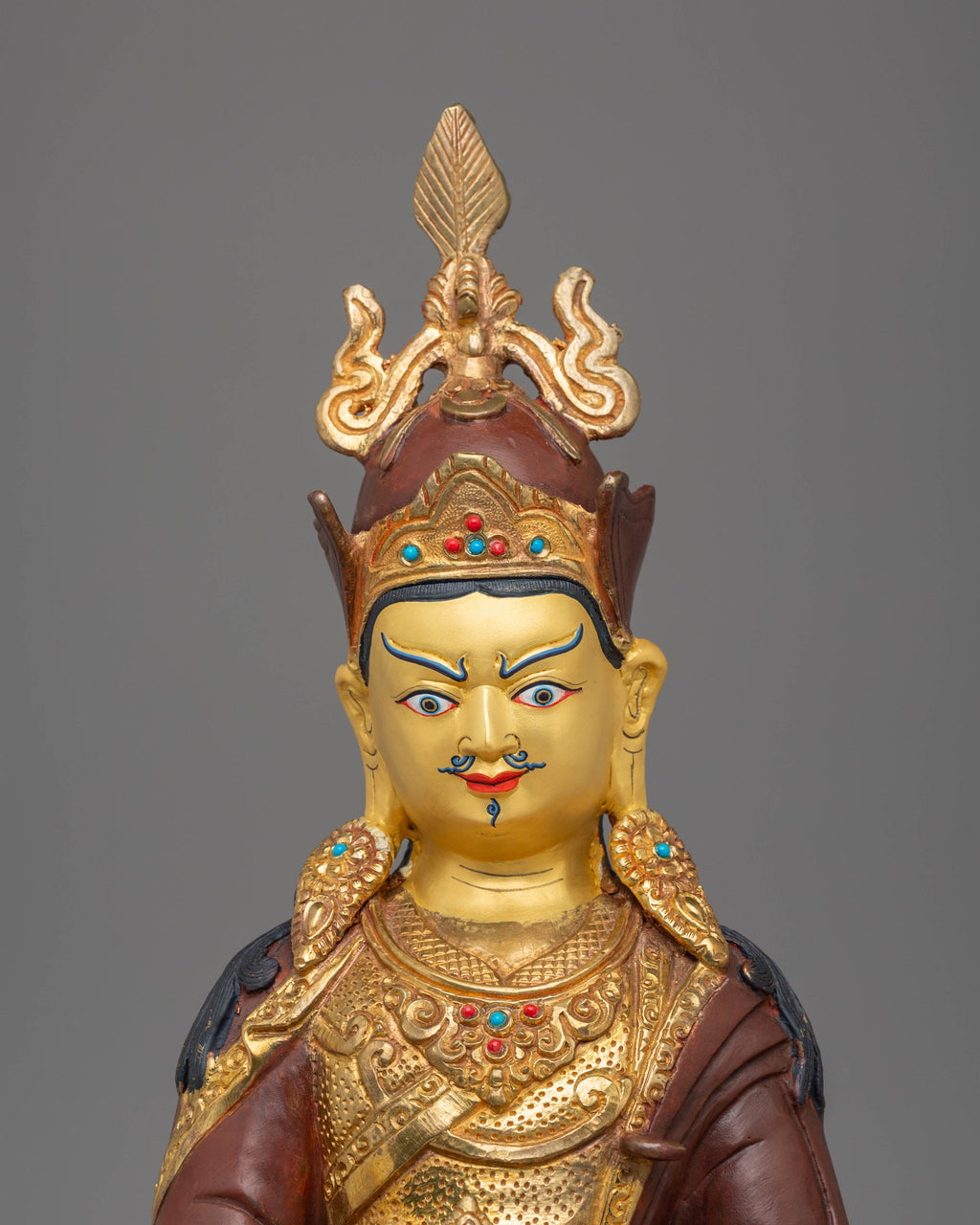 This sacred statue showcases Padmasambhava in a meditative pose, reflecting his deep connection with the divine and his teachings of compassion. The gold-plated finish enhances the statue's intricate details, emphasizing the enlightenment Padmasambhava represents. The use of coral and turquoise, traditional stones in Tibetan art, further elevates the statue's spiritual significance, embodying wisdom, protection, and divine energy. The combination of gold plating and these sacred materials makes this statue a perfect representation of spiritual teachings.