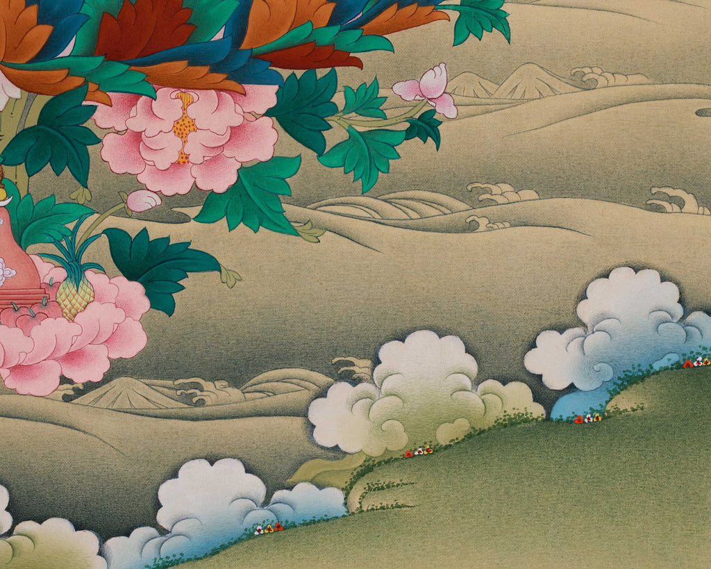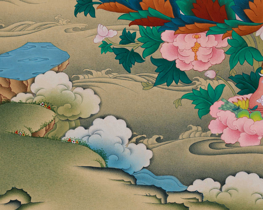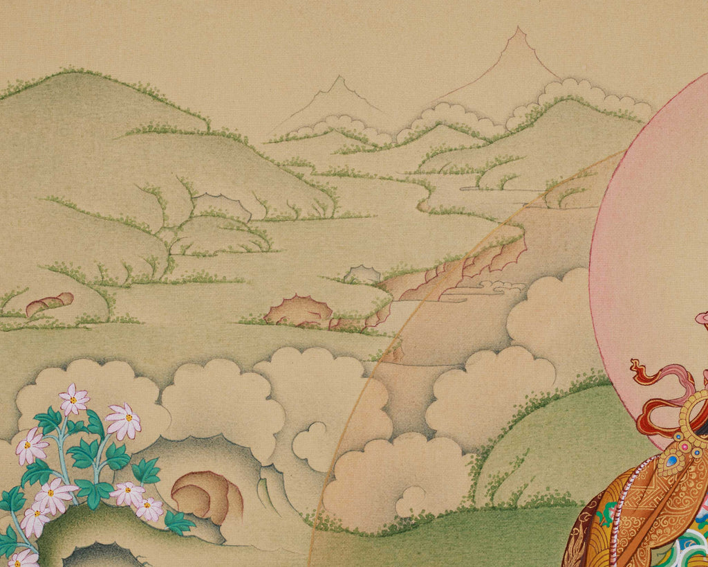 A Thangka depicting Padmasambhava, a spiritual leader, is a vital representation of one of the most venerated figures within Tibetan Buddhism. To ensure durability and authenticity, this Thangka was carefully hand-painted in our studio using premium cotton canvas, 24K gold, and natural Lhasa stones. This artwork employs the Tibetan Buddhist painting technique known as Karma Gadri, distinguished for its clarity, elegance, and intricate detailing. Karma Gadri art, historically used for religious and meditative purposes, is characterized by symmetrical line work, vivid colors, and spiritual imagery that evoke a tranquil yet powerful atmosphere.