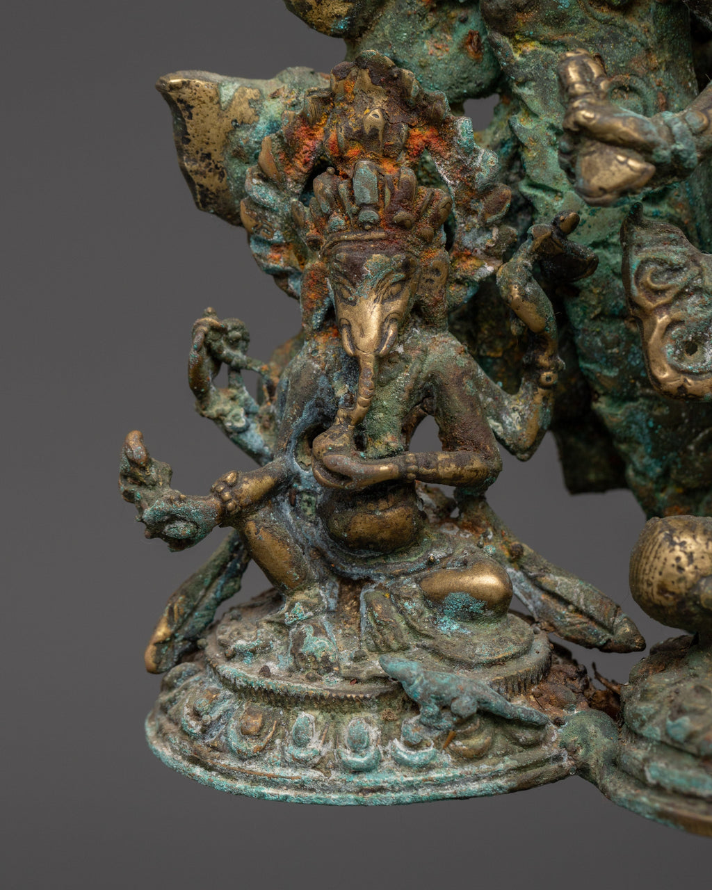 The design of the Panas Statue Oil Lamp includes a central figure of a deity or spiritual being, surrounded by beautifully sculpted details that represent the divine and the sacred. The brass body, with its antique finish, gives the lamp an aura of reverence and antiquity, symbolizing spiritual illumination and the divine presence. The oil lamp is designed to hold oil for lighting, representing enlightenment and wisdom, with the flame signifying the inner light that guides the spiritual practitioner on their path to enlightenment.