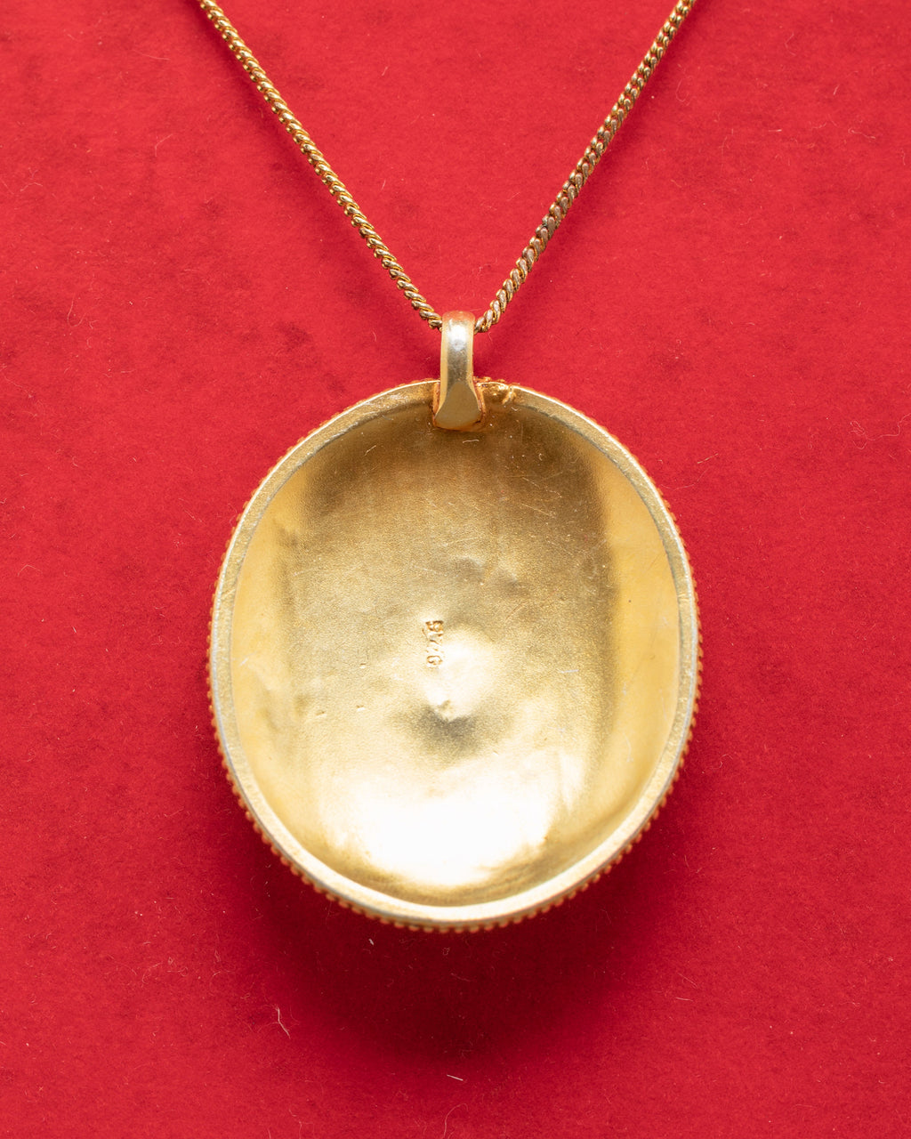 A Buddhist locket is a piece of jewelry designed to hold a small prayer, mantra, or image related to Buddhist practice. The locket may feature a design or image of a Buddhist deity, such as the Buddha, or a representation of a sacred symbol, like the lotus flower. It is typically worn as a talisman to remind the wearer of their spiritual path and to offer protection. Some Buddhist lockets are also used as a form of religious devotion and are frequently given as gifts to friends and family members to provide them with spiritual support and blessings.
