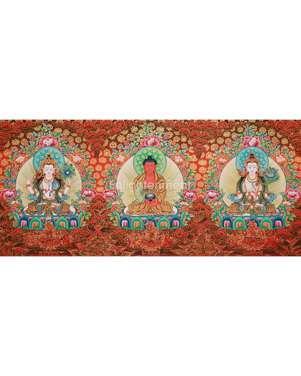 This thangka, created with 24K gold on a red canvas, is an exquisite work that harmoniously combines wisdom, compassion, and light to illustrate the enlightened path. The red canvas amplifies the brilliance of the gold details, highlighting the divine essence of these Bodhisattvas. This remarkable artwork acts as a reminder of the core principles of Tibetan Buddhism, serving as a focal point for meditation and contemplation on incorporating the virtues of light, wisdom, and compassion into your spiritual journey.