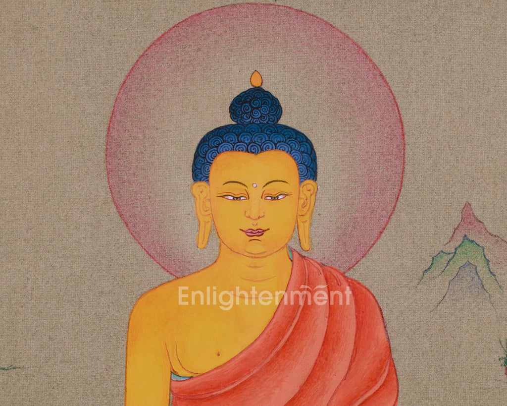 The Peaceful Deity Shakyamuni Buddha Thangka is a sacred artwork that depicts Siddhartha Gautama, the historical Buddha. It is painted on cotton canvas, providing a base for its detailed design. Earthy tones derived from natural stone colors impart a warm, organic appearance to the piece and enhance its spiritual ambiance. Authentic 24K gold accents are meticulously applied, emphasizing key features of the Buddha and imparting a divine radiance that boosts its sacredness.