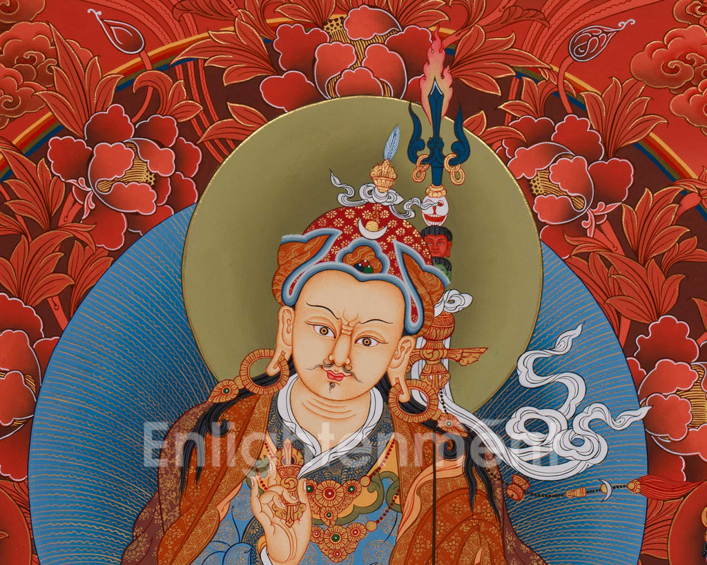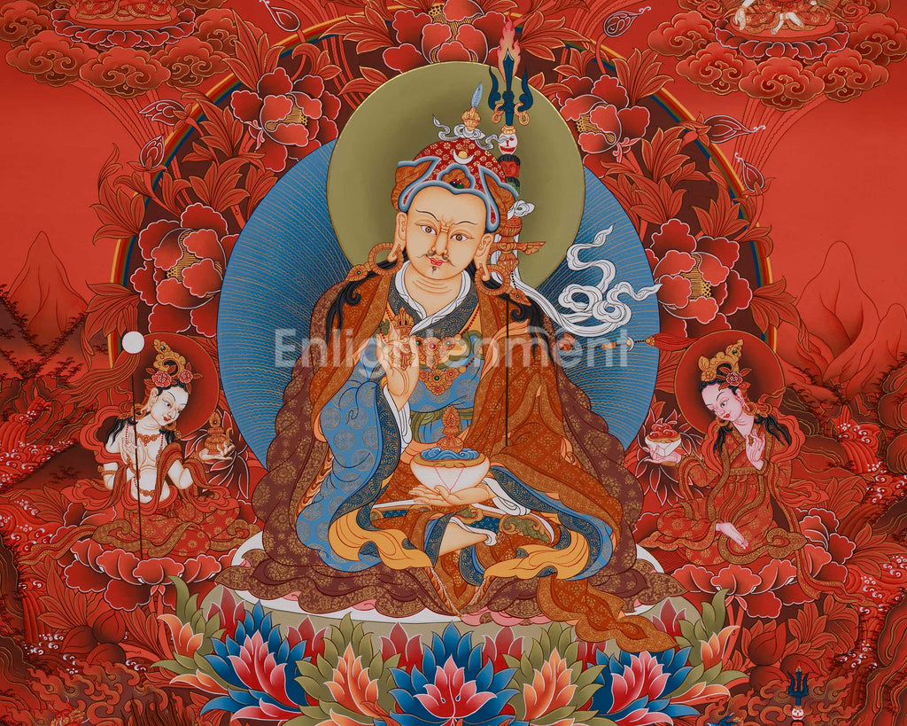 The Peaceful Guru Tsokye Dorje thangka is an exquisite representation of Guru Rinpoche (Padmasambhava), positioned at the center of a divine composition filled with sacred deities and symbols. Measuring 20 inches (51 cm) in width and 30 inches (76 cm) in height, this large artwork is painted on premium cotton canvas, ensuring durability and vibrant detail. Guru Rinpoche is seated at the center, flanked by his consort Yeshe Tsogyal and Mandarva, embodying wisdom and spiritual purity. The overall red hues of the thangka signify transformation, strength, and spiritual enlightenment.