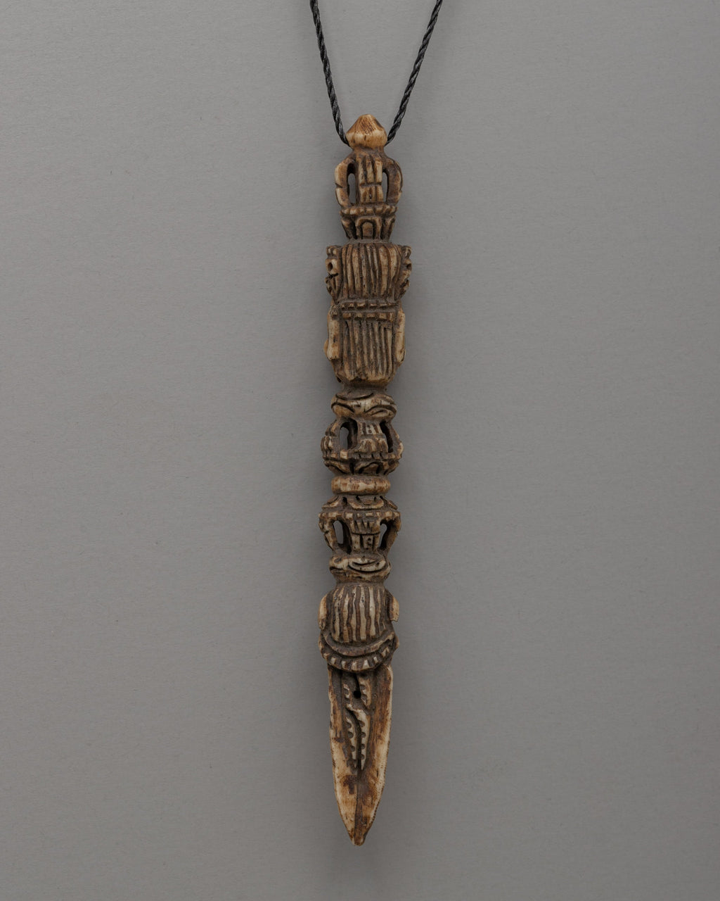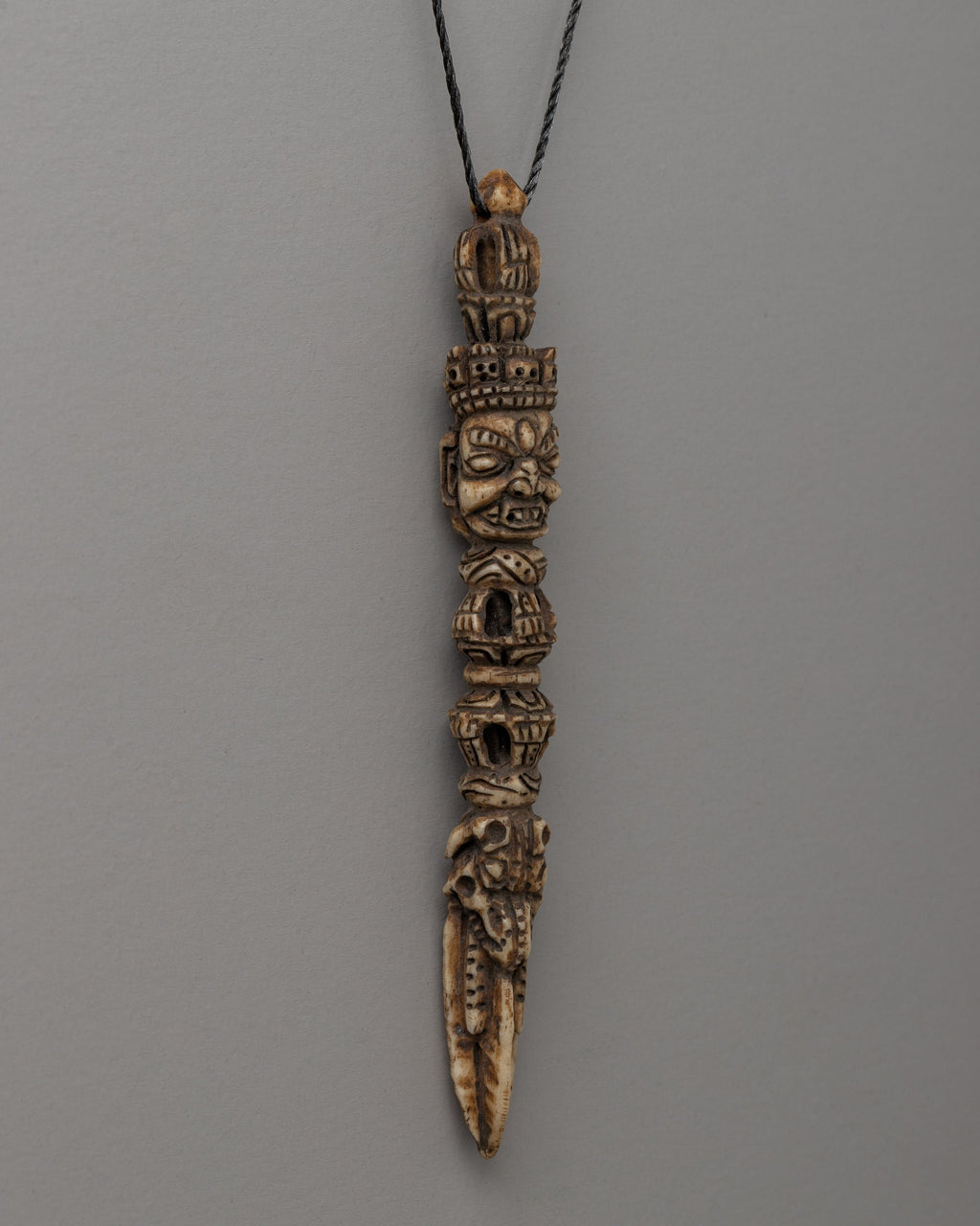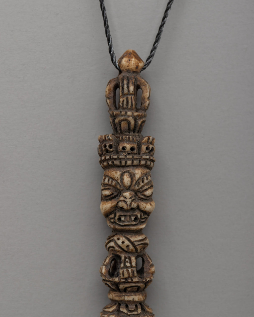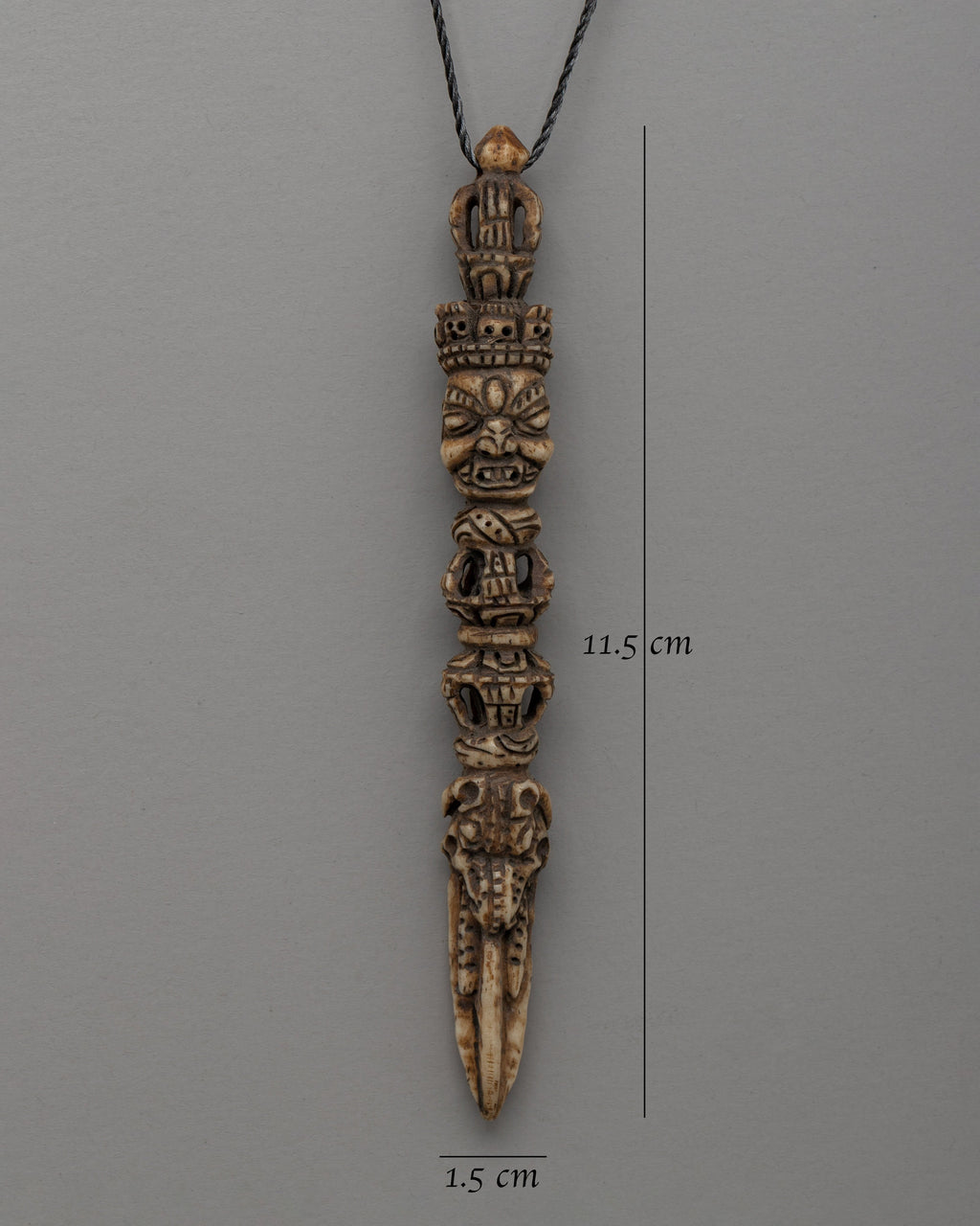 This Phurba-inspired locket, which is made from buffalo bone that is ethically obtained, features elaborate carvings that demonstrate the skill of traditional workmanship. At the top of the intricate pattern is a depiction of the angry god, who stands for extreme compassion and the capacity to eradicate ignorance. The three-sided blade below is intricately engraved to represent the conversion of negative feelings into insight, empathy, and clarity. At 1.5 cm in width and 0.012 kg in weight, this locket is both lightweight and substantial, making it ideal for everyday use or as a unique item for ceremonial purposes. This handcrafted locket connects you to the profound teachings and traditions of Buddhism and makes a thoughtful gift or cherished personal talisman.