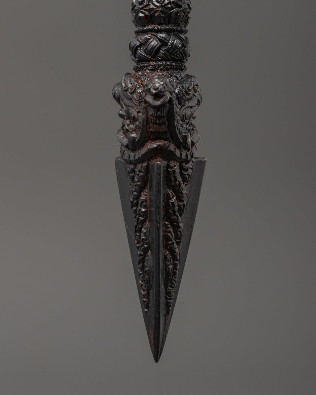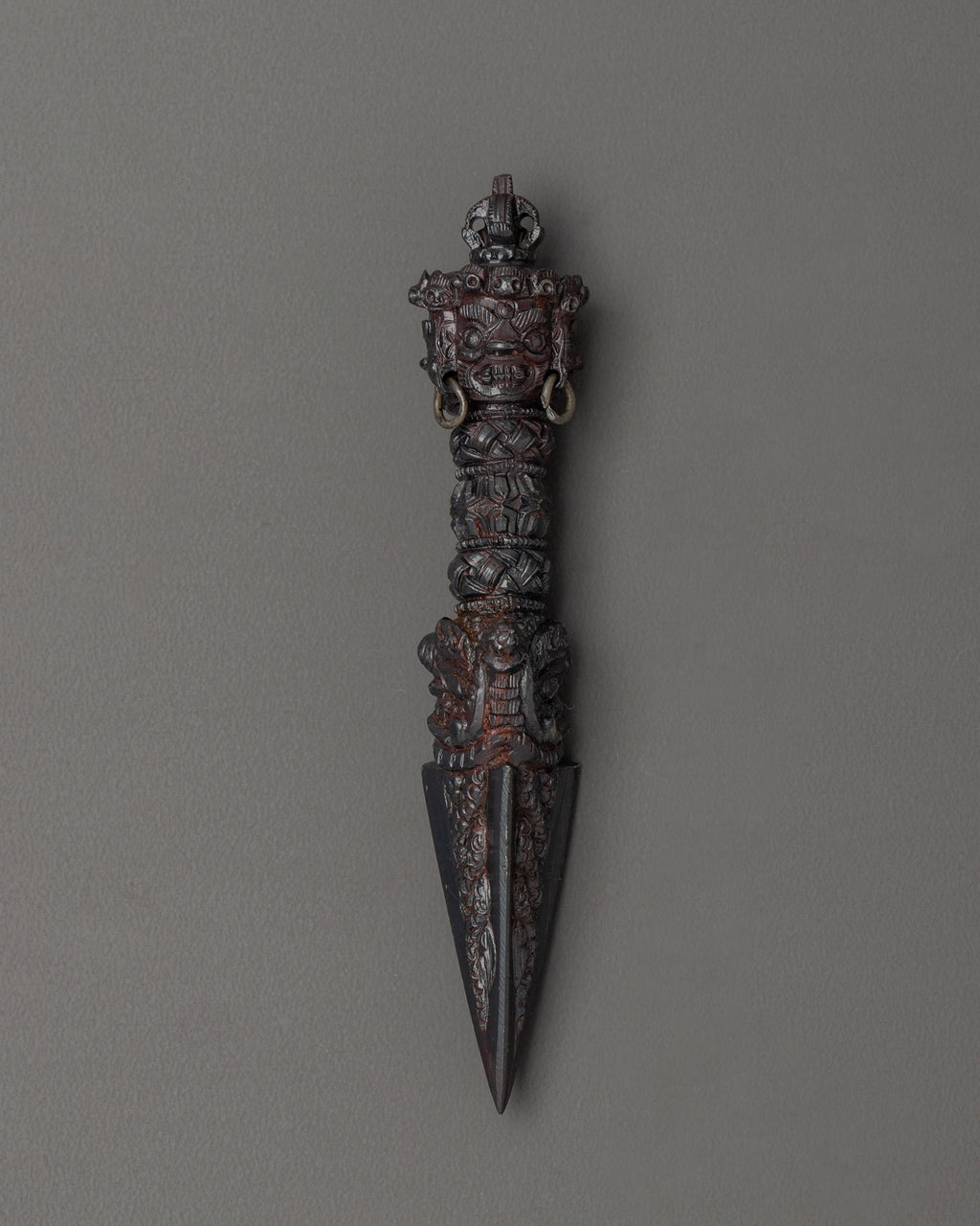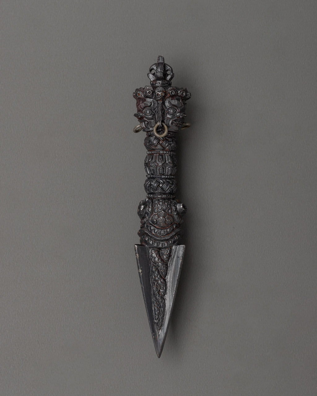 The Phurba, a ritual dagger, is used in Vajrayana Buddhism and Tantric practices to remove negativity, anchor spiritual energy, and cut through illusion. Though modest in size, this altar Phurba contains significant symbolic power, representing the combination of wisdom and compassion while also aiding in cleaning one's space and psyche.
