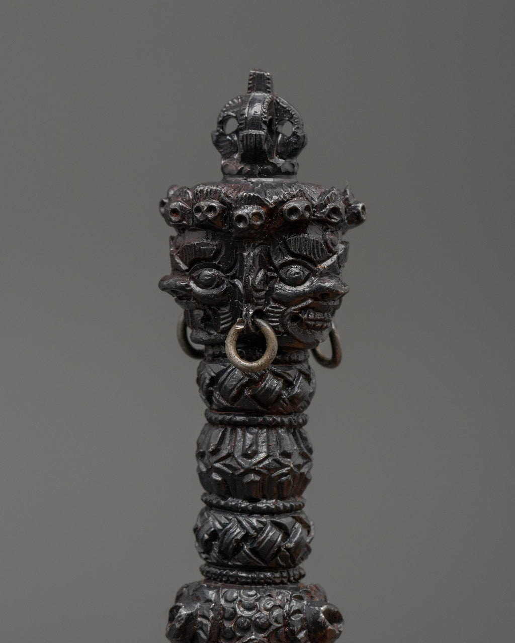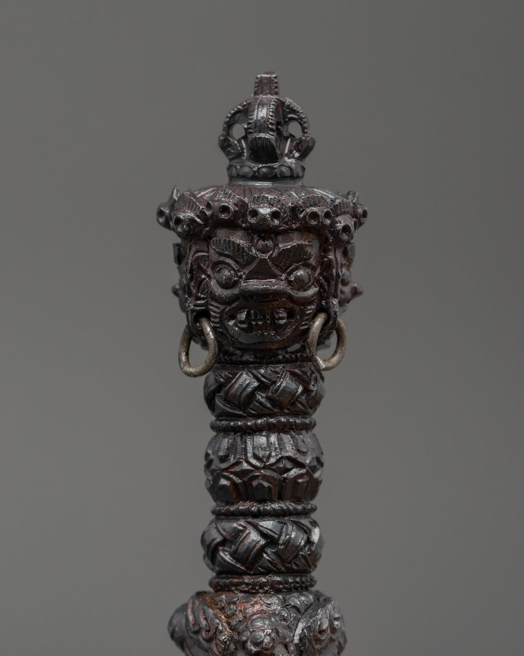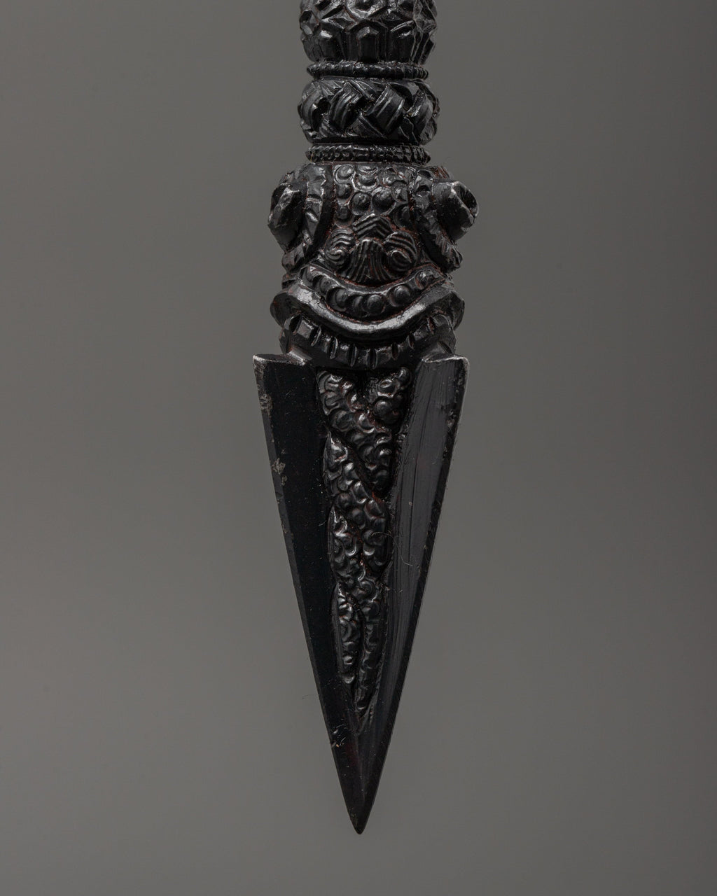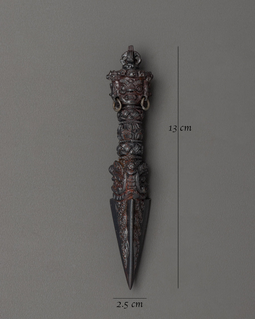 The Phurba, a ritual dagger, is used in Vajrayana Buddhism and Tantric practices to remove negativity, anchor spiritual energy, and cut through illusion. Though modest in size, this altar Phurba contains significant symbolic power, representing the combination of wisdom and compassion while also aiding in cleaning one's space and psyche.