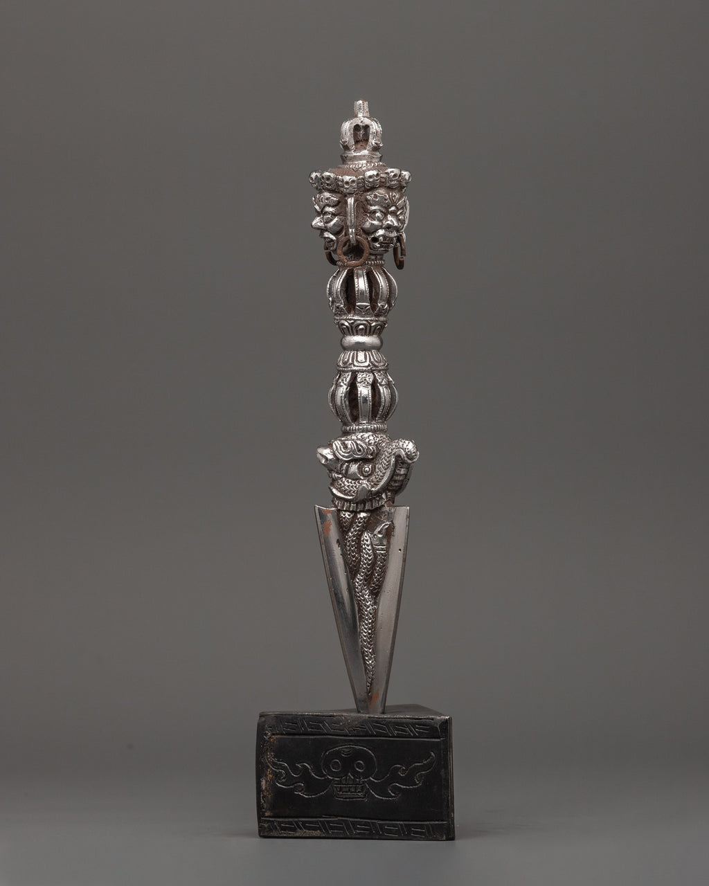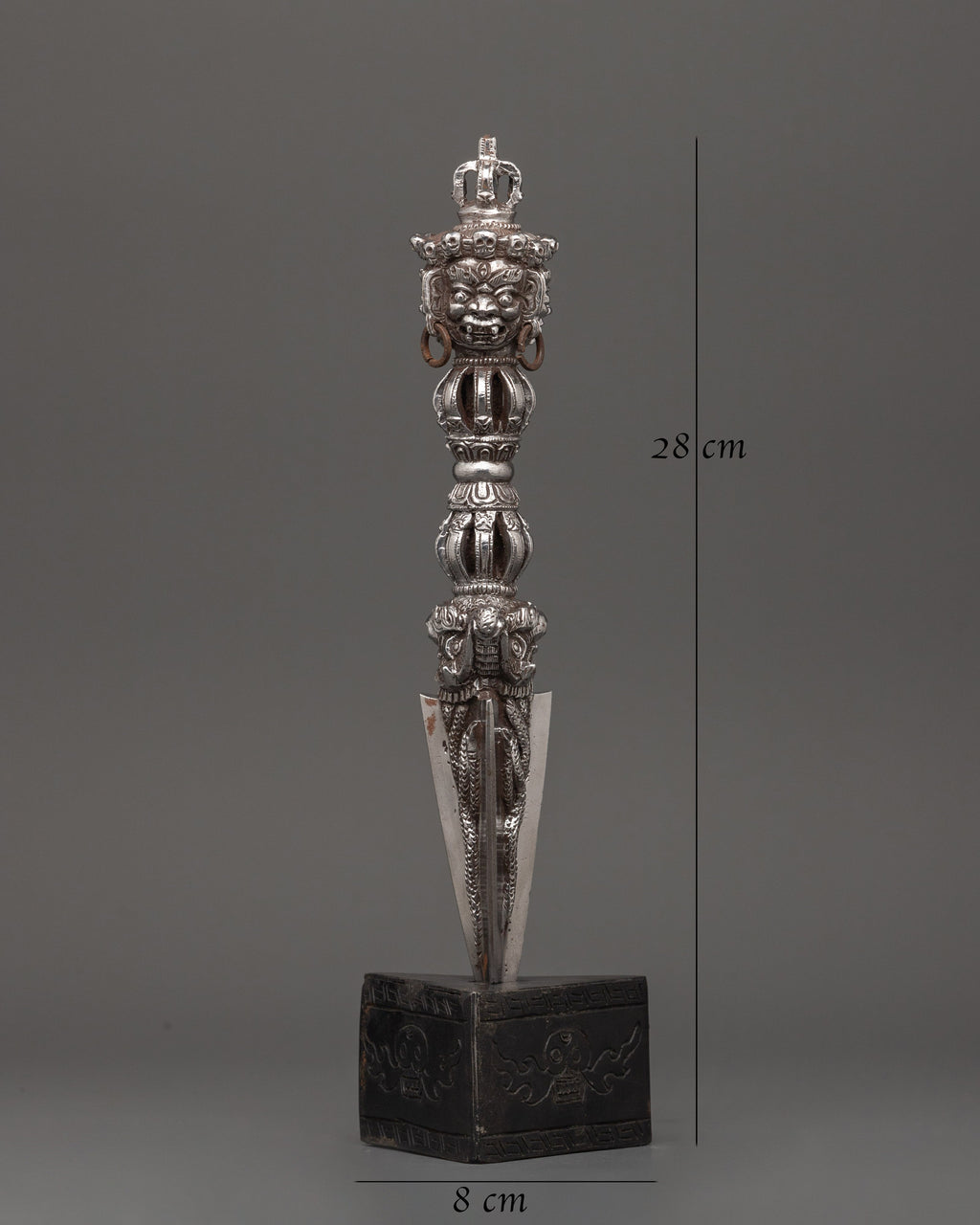 The Phurba, or ritual dagger, is valued for its symbolic ability to suppress bad energies, remove spiritual impediments, and anchor heavenly attention. Its three-edged blade symbolizes the transcendence of ignorance, desire, and hatred. This Phurba dagger is ideal for shrine placement, altar work, or contemplative rituals, serving as a conduit for protection, cleansing, and spiritual transformation.