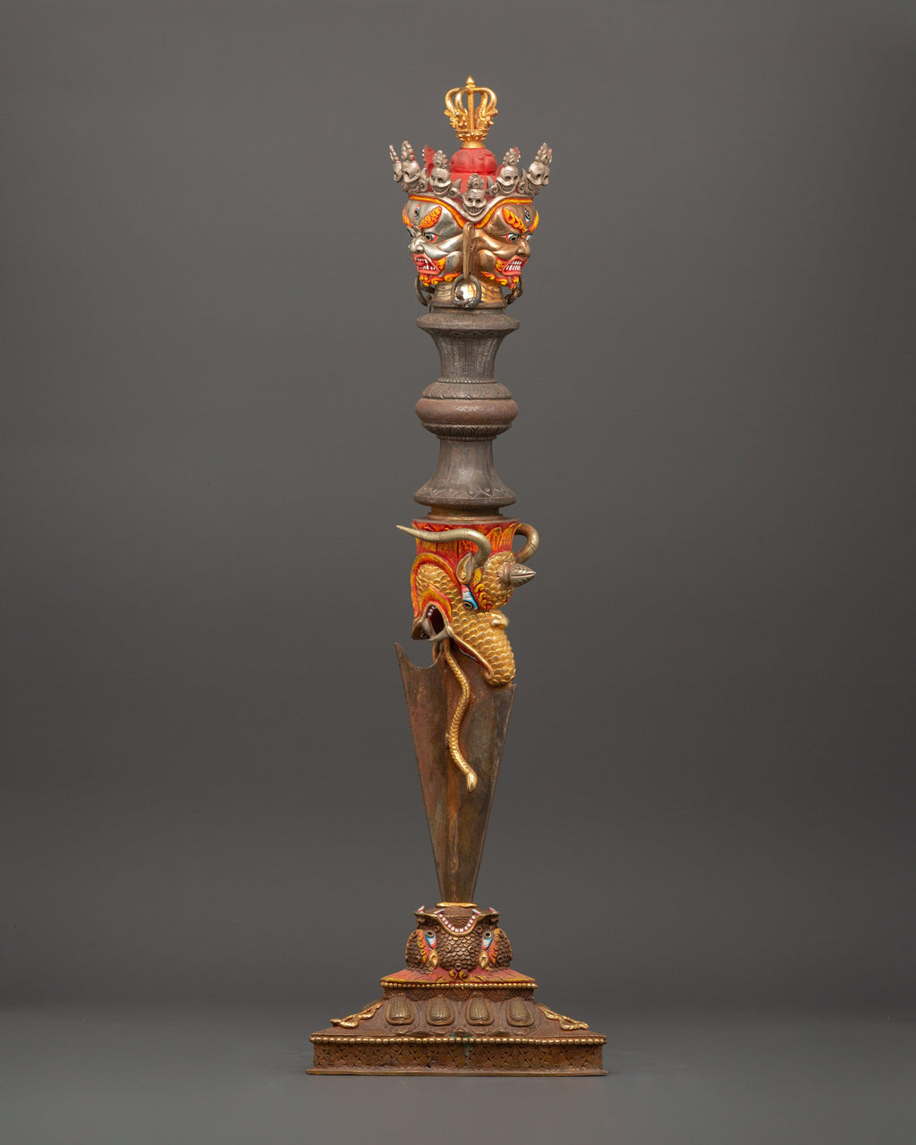 Phurba Sacred Ritual Item with Wrathful Head and Three-Faced Deity Head