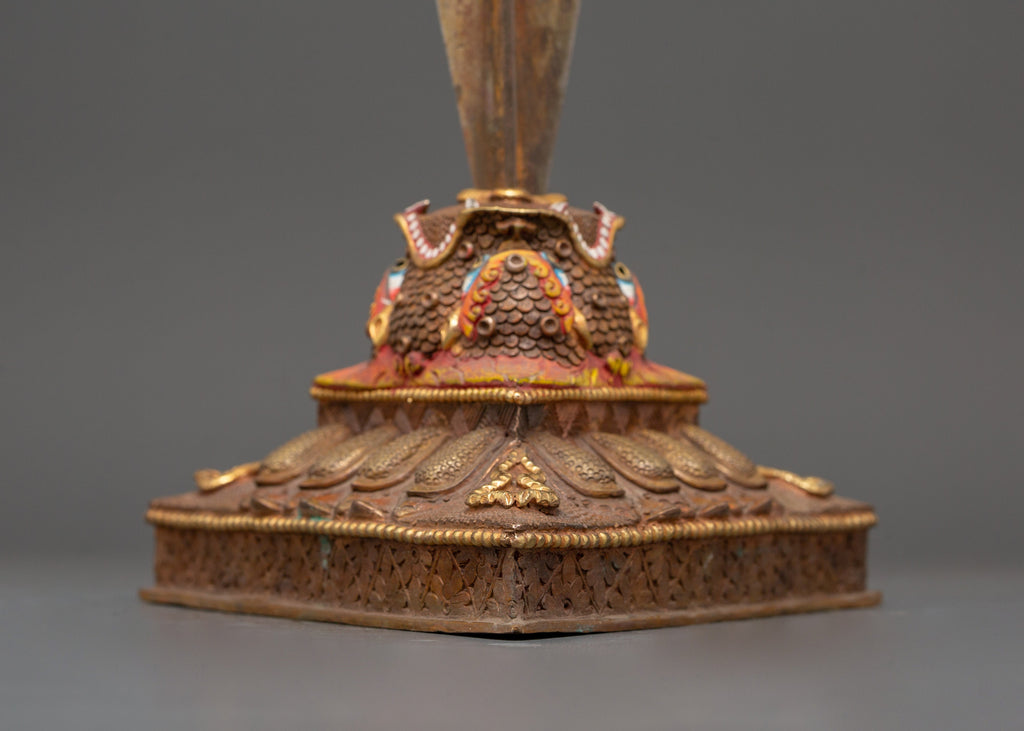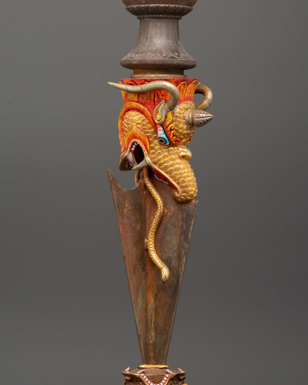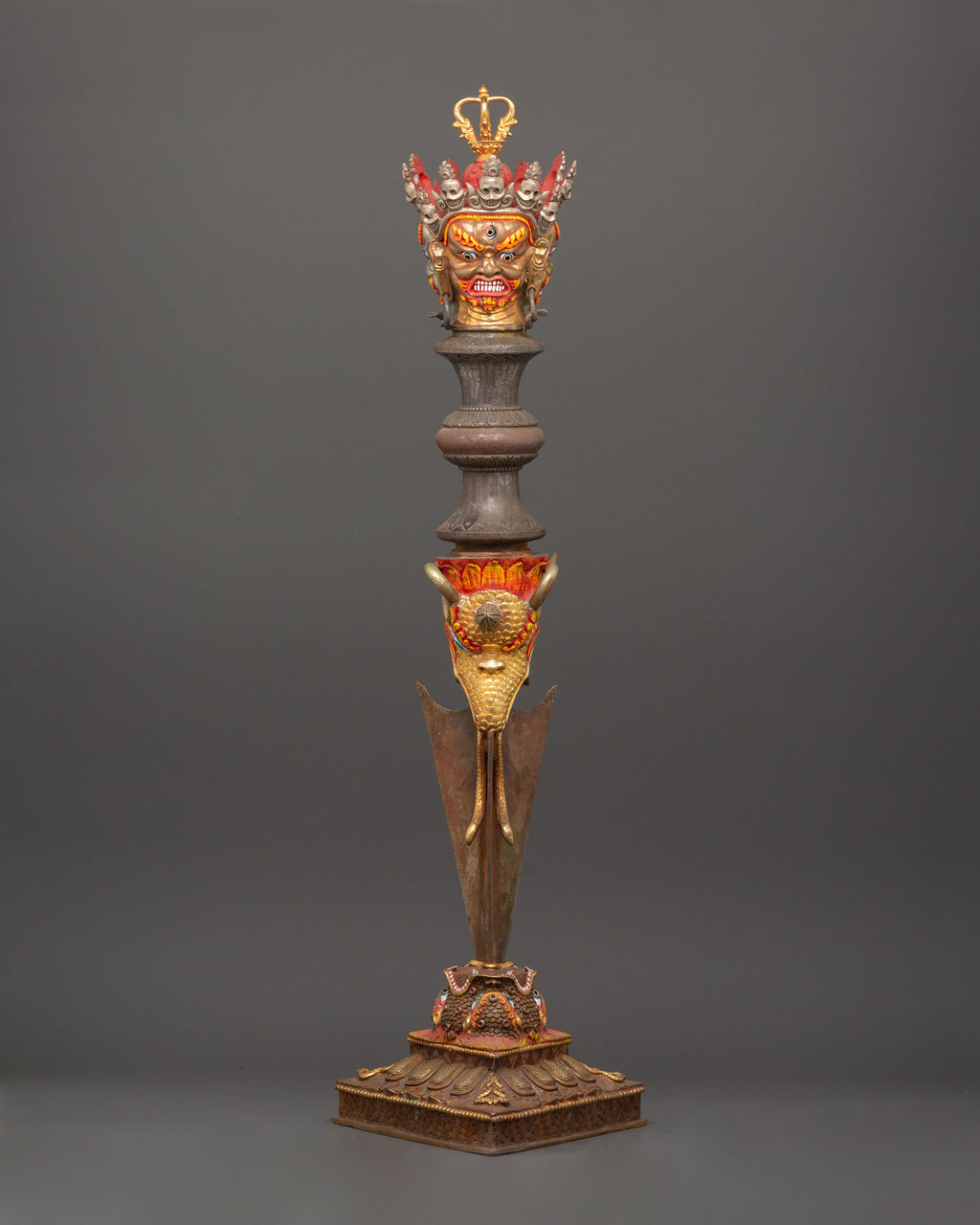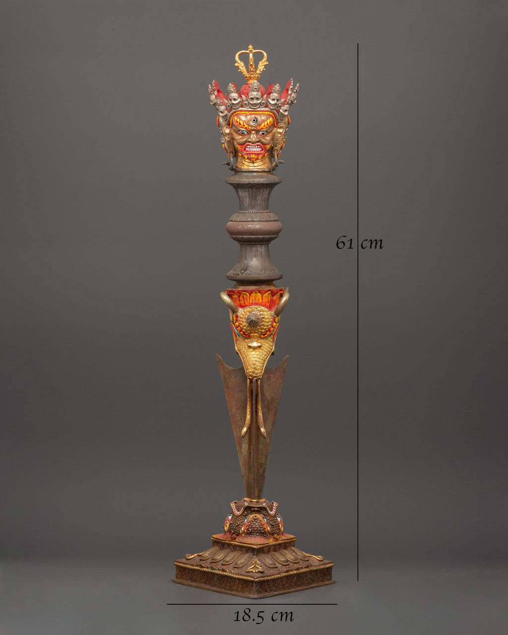This beautiful Phurba Sacred Ritual Item stands 61 cm tall and 18.5 cm wide. This remarkable ceremonial weapon weighs 4.74 kg and comprises copper, iron, gold plating, silver plating, and an acrylic color. The Phurba, a ritual blade, has long been utilized in Tibetan Buddhist ceremonies to represent the elimination of bad energies. Its strong three-blade shape symbolizes eradicating negative energy, making it an indispensable instrument for spiritual practitioners.
