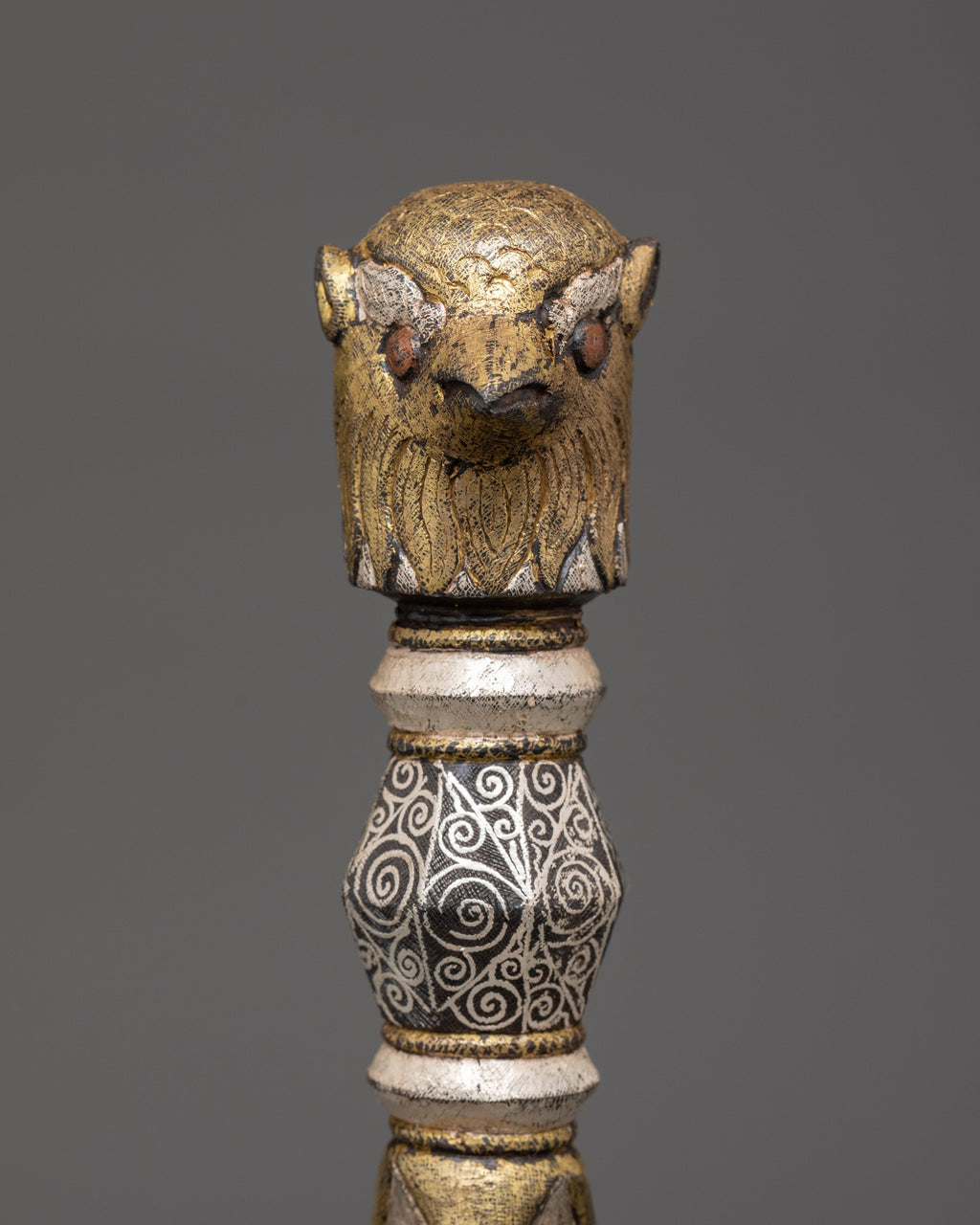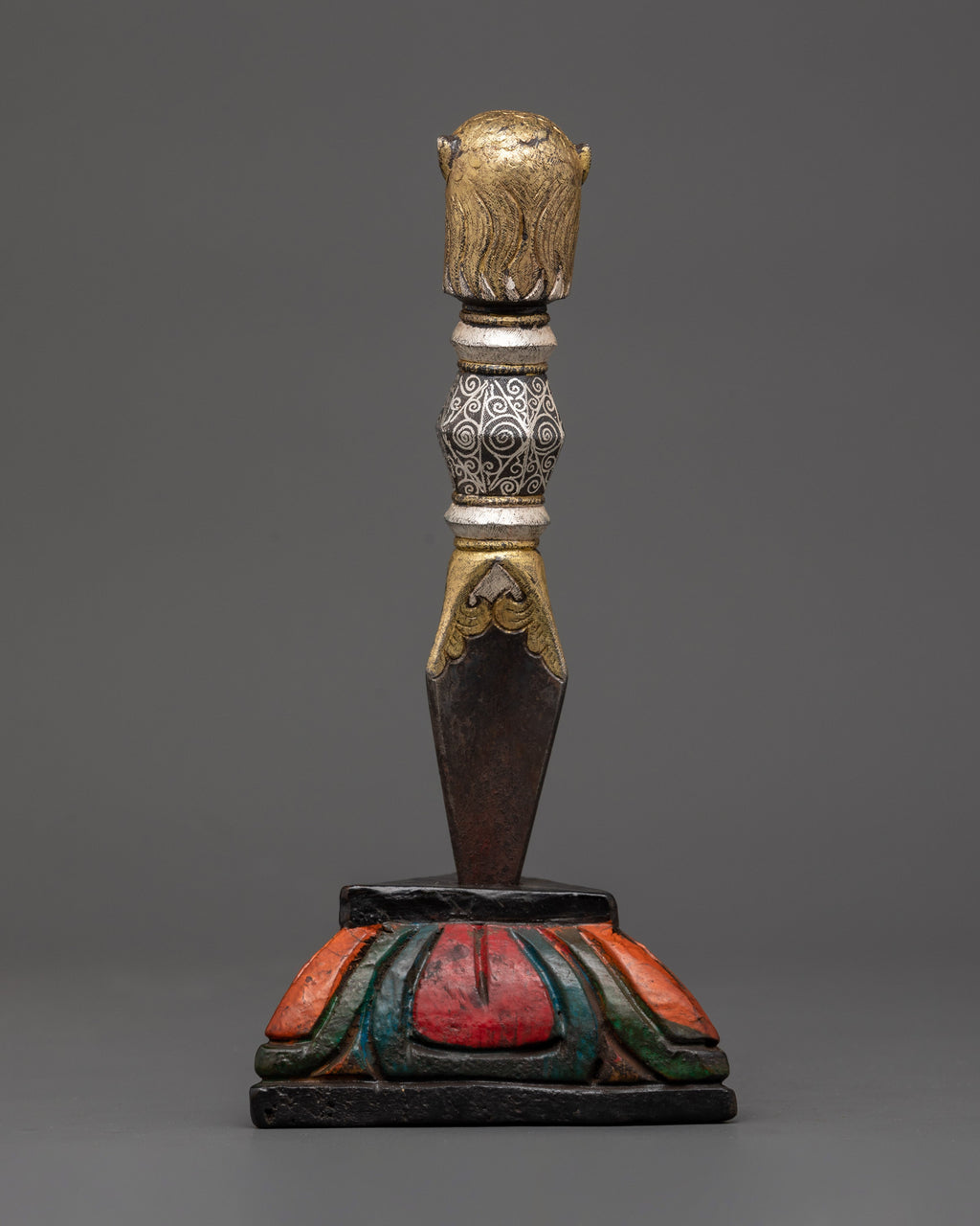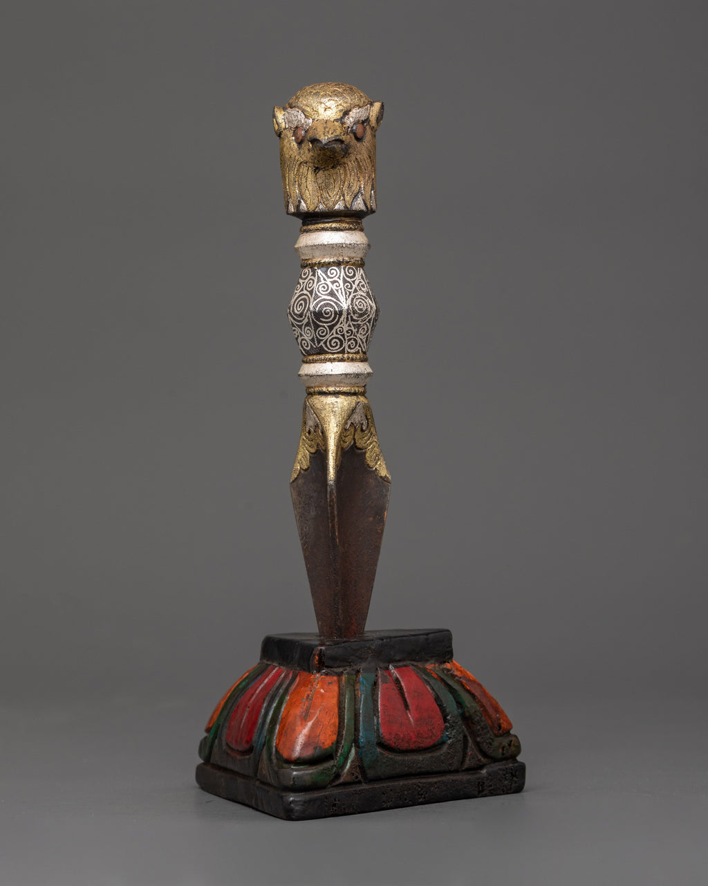 Phurba with Garuda Head is a sacred ritual dagger based on Himalayan and Tantric traditions. This powerful 22cm weapon depicts Garuda, the mythical bird deity who is said to destroy negativity and dispel evil. This handcrafted Phurba represents the cutting through of ignorance and illusion, and is an essential spiritual ally for Vajrayana Buddhists and Tibetan ritualists. The significant term, "Phurba with Garuda Head," ties this vital tool to its traditional use in meditation, space clearing, and protective ceremonies.