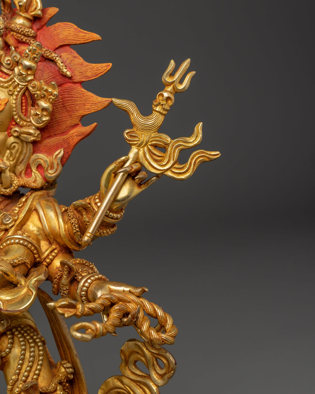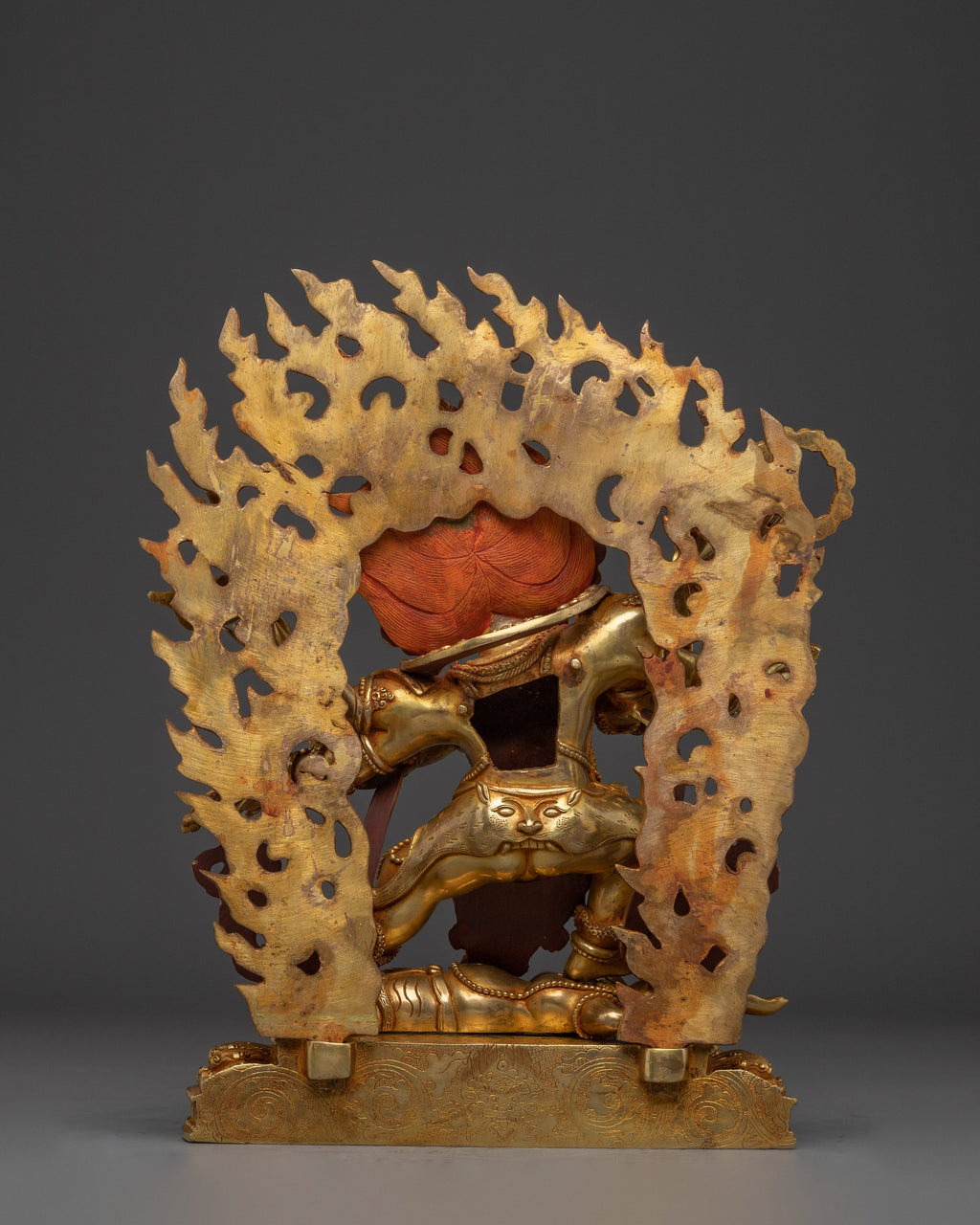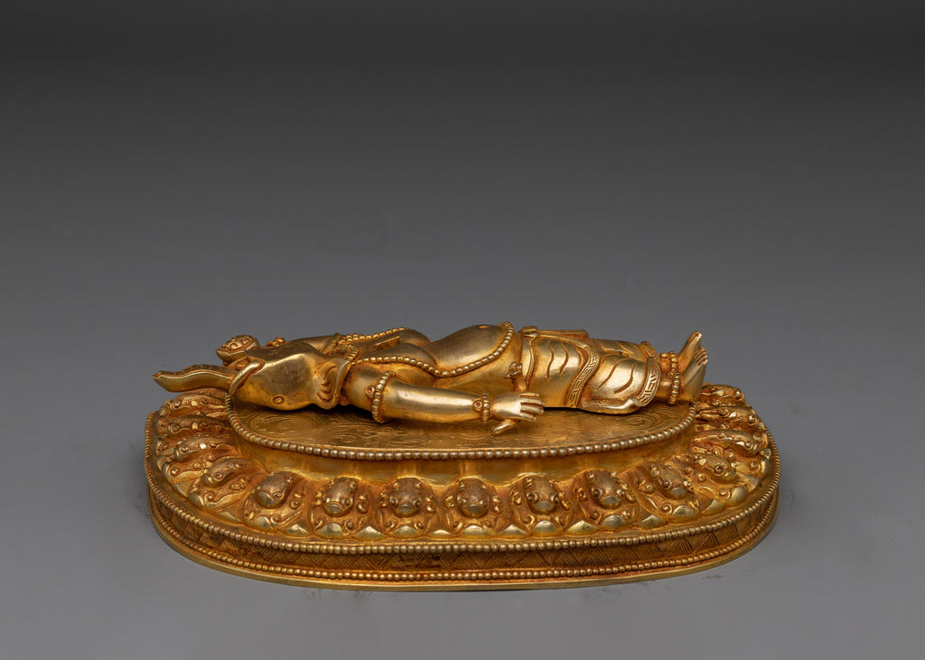 The six-armed Mahakala is depicted in a dynamic and commanding position, carrying six symbolic implements that represent his capacity to destroy ignorance and negativity. His wrathful expression radiates power and determination, while the intricate design, ornaments, and detailed carving of his crown demonstrate Nepalese craftsmanship. The Statue enhances the divine presence of the Mahakala and serves as a potent reminder of its role in protecting the Dharma and guiding practitioners to spiritual liberation.