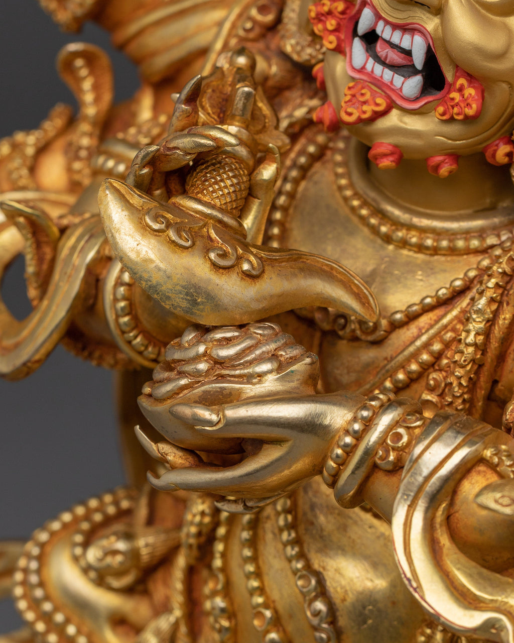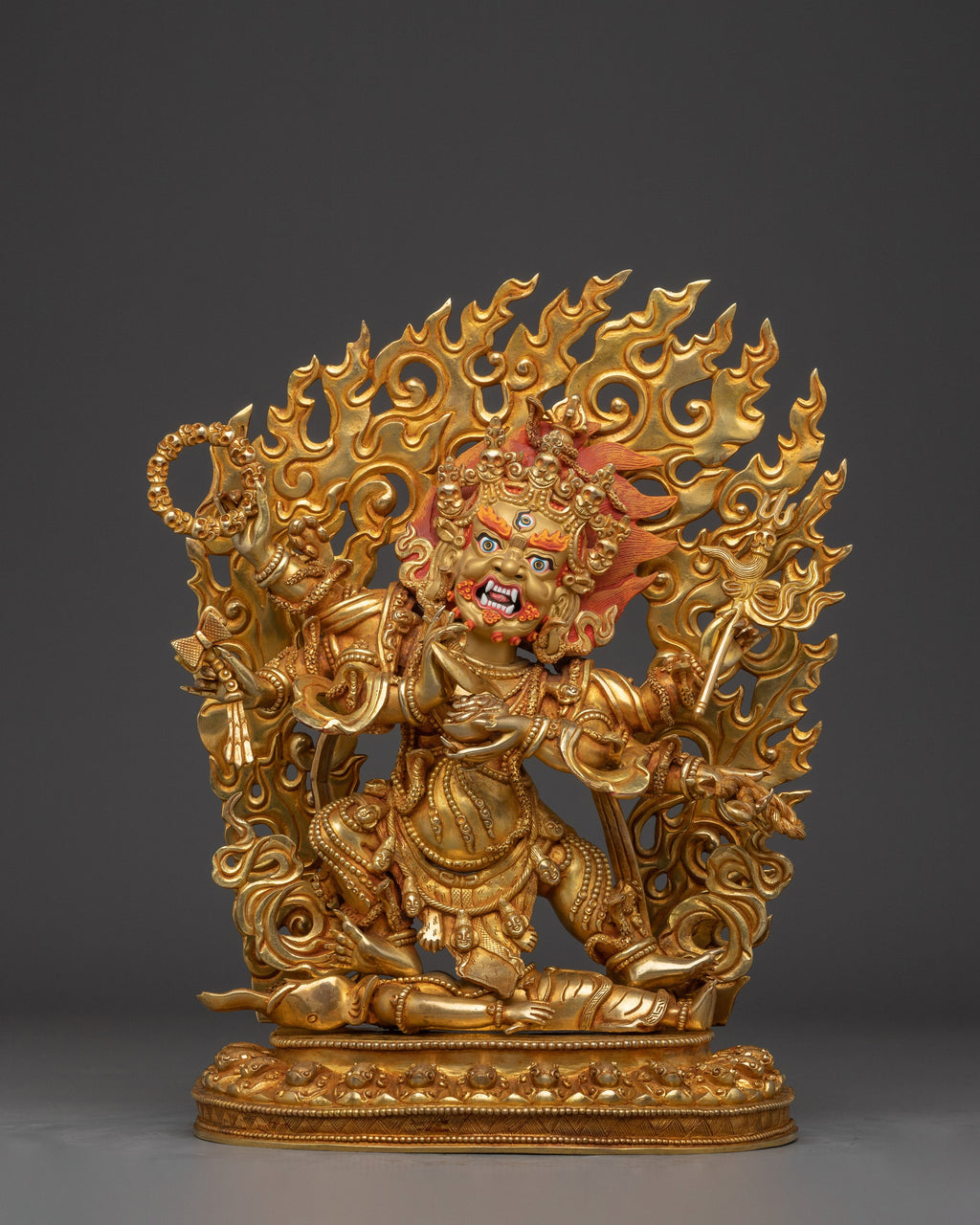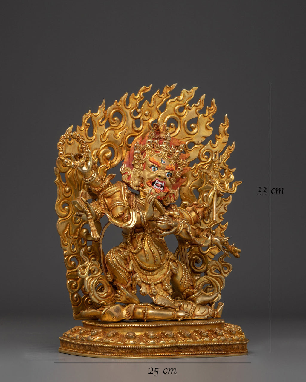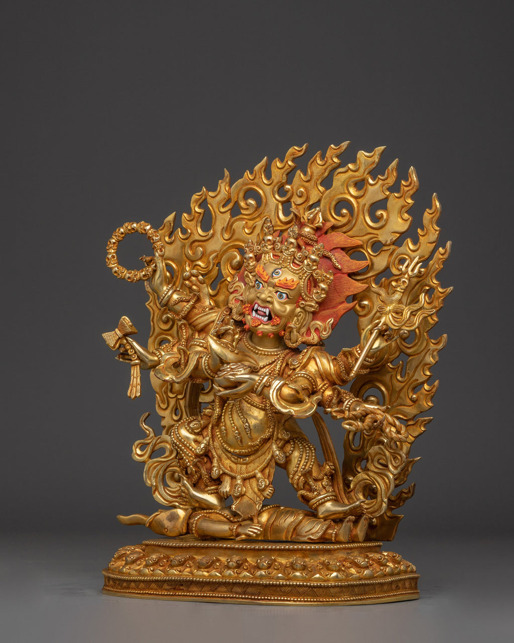 Powerful Protector 6 Armed Mahakala Statue measures 13 inches (33 cm) in height with a base of 9.8 inches (25 cm) and weighs 5.28 kilograms. Made from a copper body, 24K gold gilding, and detailed gold and acrylic paintings. The statue vividly portrays Mahakala’s fierce protective presence with six arms, symbolizing powerful guardianship and wrathful compassion. A masterful blend of artistry and spiritual symbolism, this piece stands as a commanding emblem of Tibetan Buddhist protection.