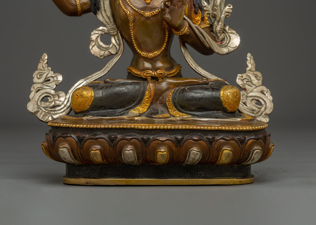 This Prajna Bodhisattva Manjushri Statue, also known as the Bodhisattva of Wisdom (Prajñā), stands at 14” (35.5 cm) in height and 10.4” (26.5 cm) at the base, weighing 4.16 kg. Made from a copper body with silver plating, and detailed with gold and acrylic paintings, this piece reflects exquisite Himalayan craftsmanship. Designed by talented Nepalese artisans, this piece is ideal for altars, meditation spaces, or as a meaningful decorative item for individuals seeking insight and clarity in their spiritual practice.