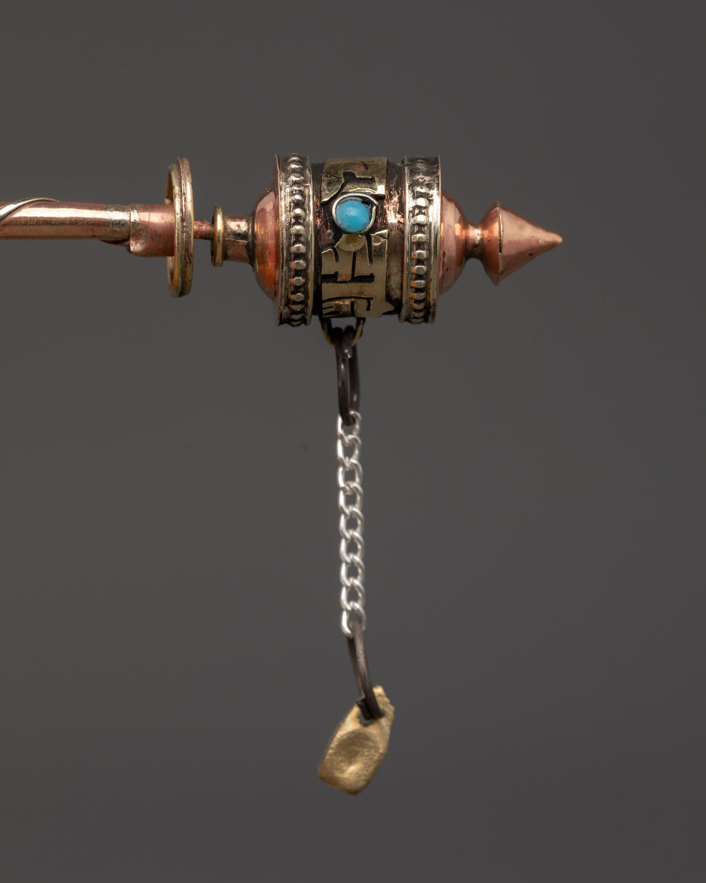 The prayer wheel, a historically used tool in Tibetan Buddhism, is believed to double the benefits of mantra chanting when spun in a clockwise direction. Inside, spiritual inscriptions—usually Om Mani Padme Hum—invoke compassion and serenity. The craftsmanship, from the elaborate body to the symbolic chain and weight, elevates this beyond a spiritual object and into a profound work of Himalayan art. Whether for personal use or as a thoughtful present, this small prayer wheel gives peace wherever it travels.