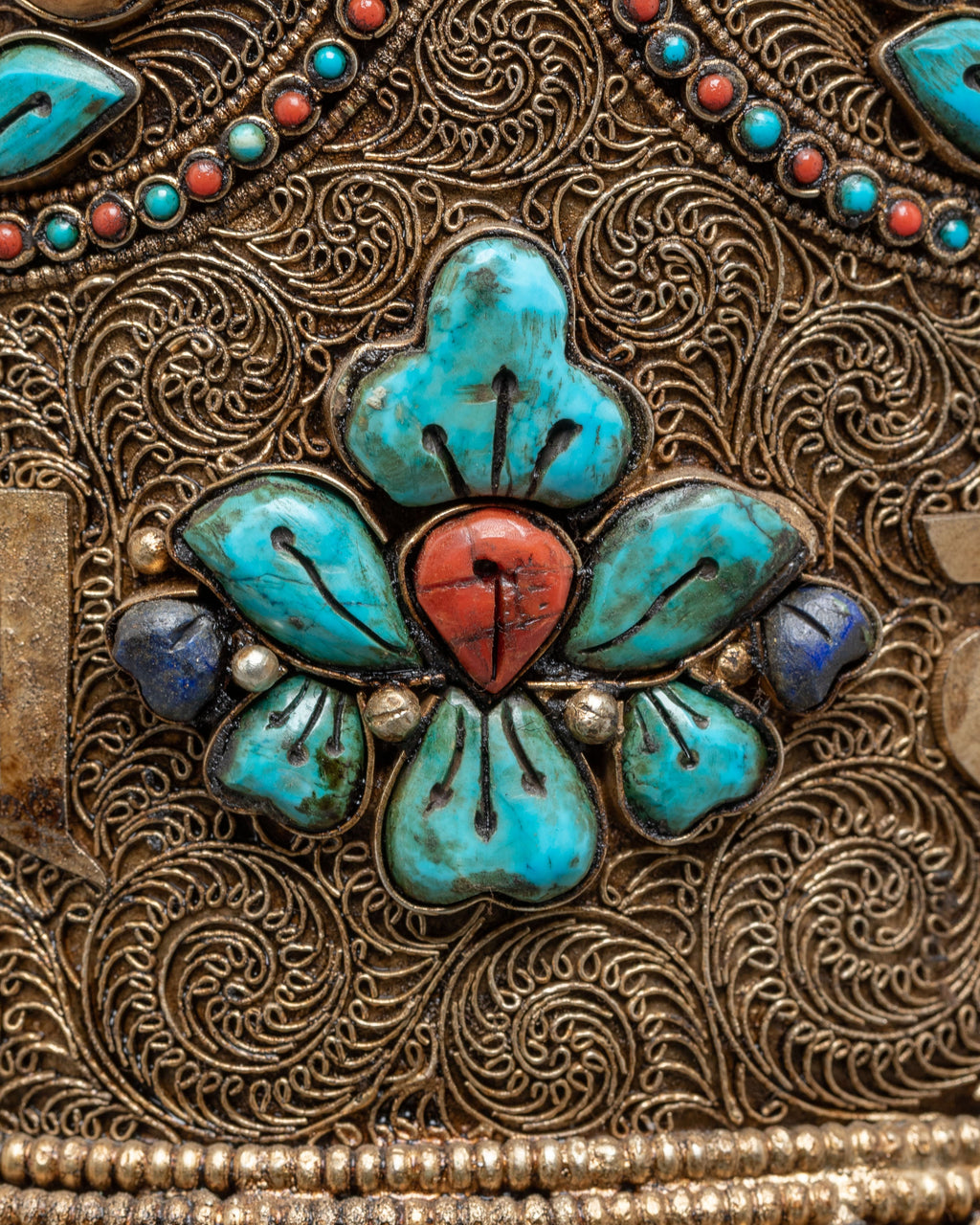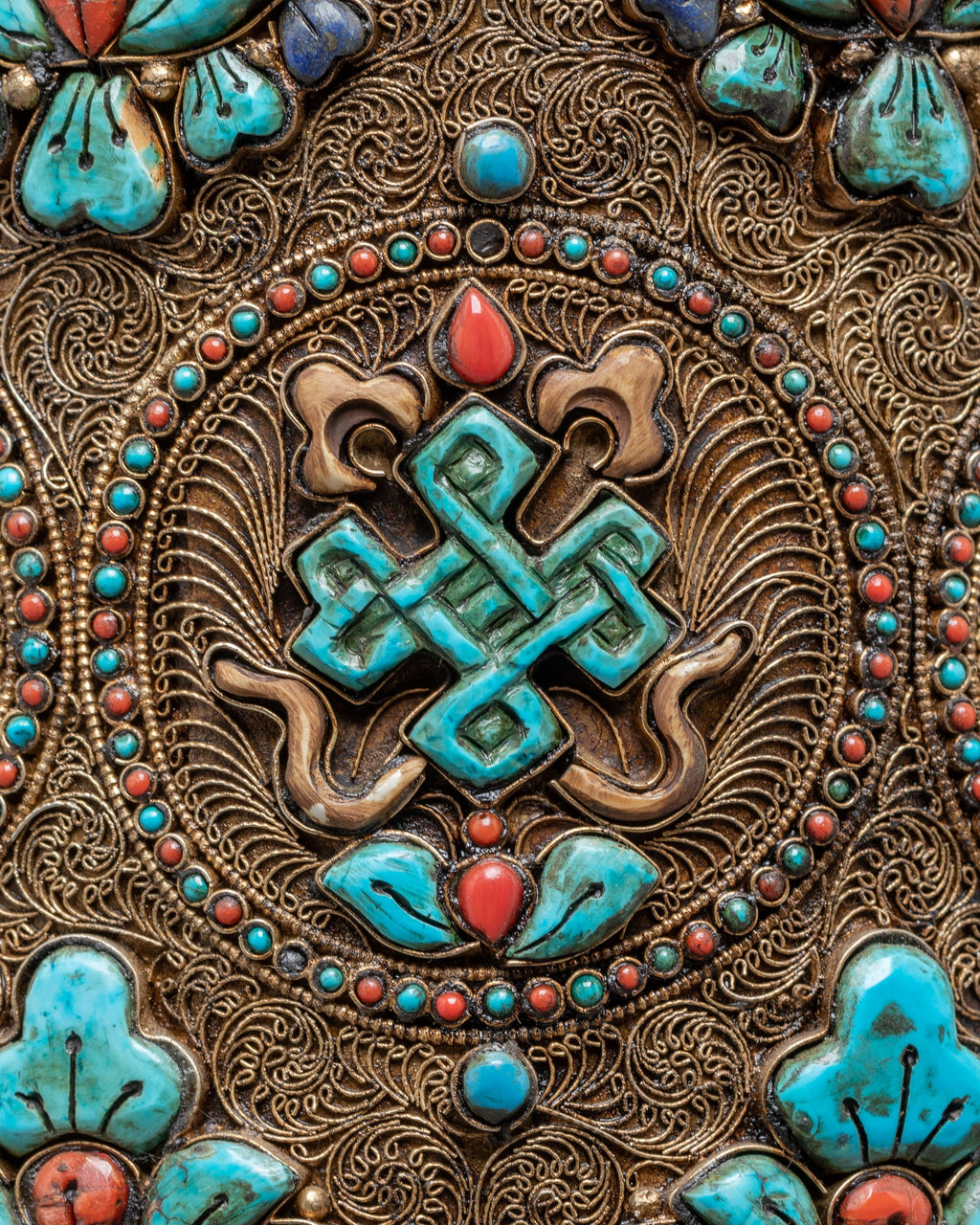 The outer surface features a whole arrangement of the revered Eight Auspicious Symbols (Ashtamangala), each carefully framed within ornate borders. These symbols — the Lotus, Treasure Vase, Dharma Wheel, Endless Knot, Victory Banner, Precious Umbrella, Conch Shell, and Two Golden Fishes — convey themes of spiritual growth, prosperity, clarity, and compassionate energy. Their placement around the wheel's body creates a rhythmic symmetry that enhances its aesthetic and symbolic essence. Additional inlays of turquoise and coral further enrich the artwork, highlighting the importance of these stones in Himalayan culture.