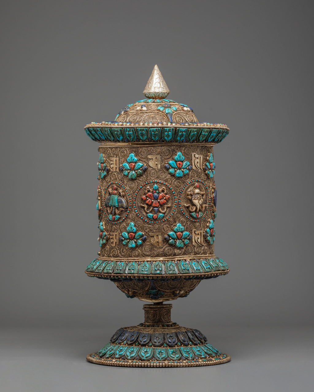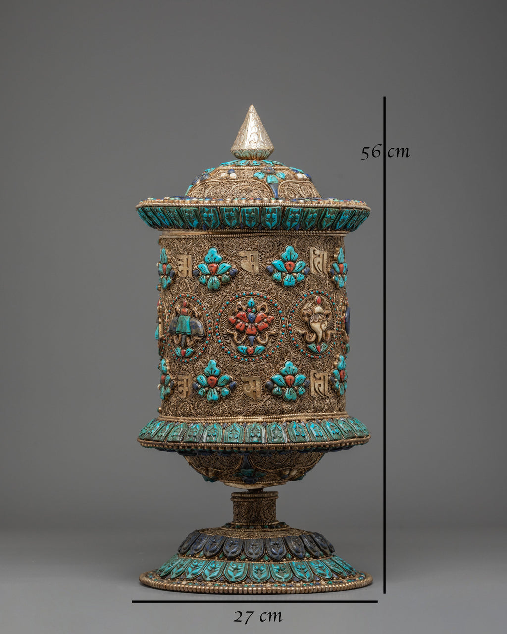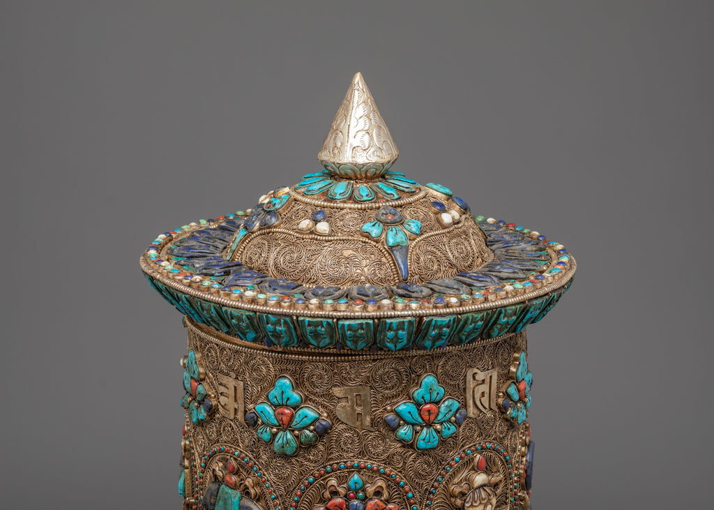Every aspect of this piece is designed to honor traditional craftsmanship while offering a meaningful ritual object for practitioners and collectors. Its finely sculpted base, layered detailing, and luminous finish make it equally suited for quiet prayer, meditative environments, and interior settings where sacred art is appreciated. The combination of silver, gold, and semi-precious stones gives the wheel a captivating presence that reflects the beauty of Tibetan spiritual art. In its form and symbolism, this prayer wheel invites reflection, devotion, and appreciation for the depth of Buddhist culture and sacred Himalayan craftsmanship.