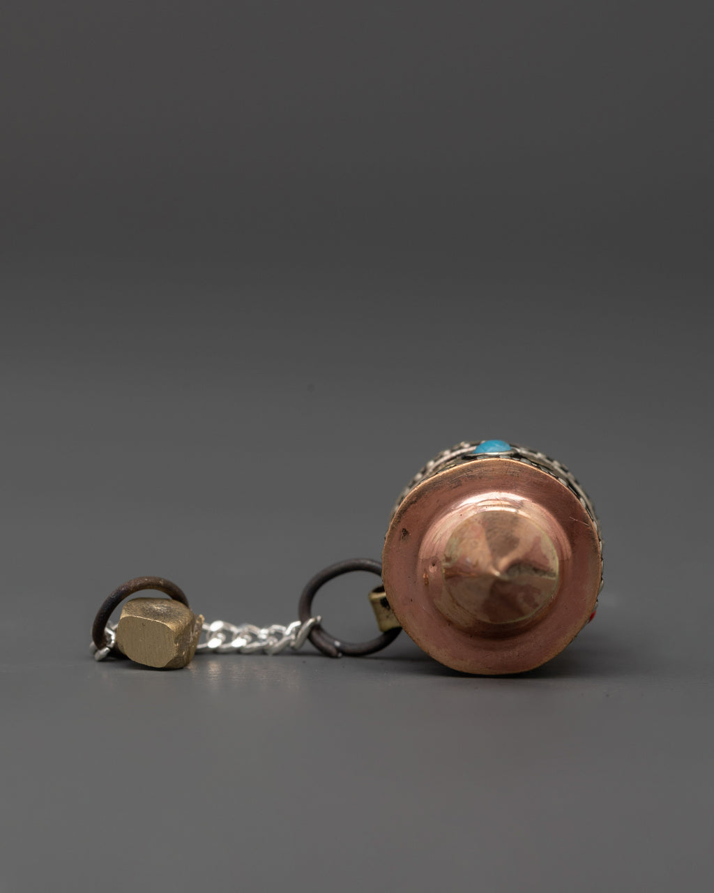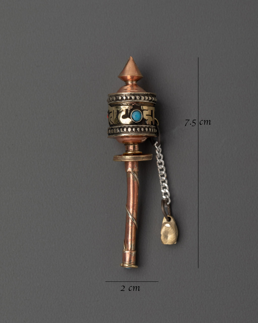 This beautifully carved Tibetan prayer wheel measures 7.5 cm in height and 2 cm in width, weighing only 0.008 kg, making it suitable for use as a personal amulet or keychain item. It is made of copper and brass and has a finely inlaid artificial turquoise stone, a symbol of traditional Himalayan workmanship. This small prayer wheel, whether carried in your pocket or displayed in your sacred space, brings immense spiritual energy to your everyday routine.