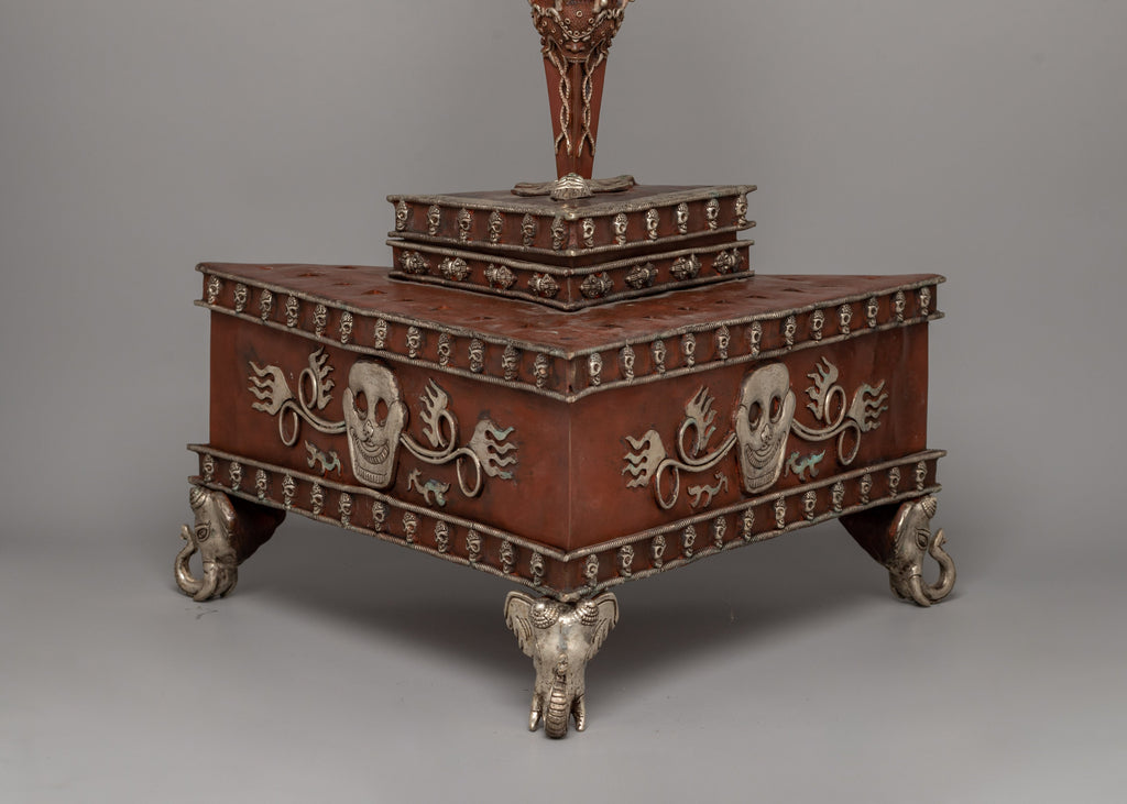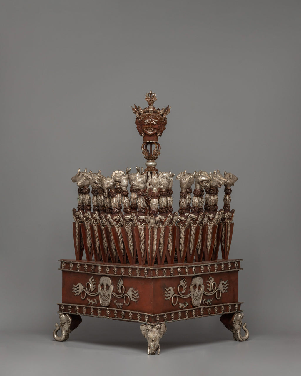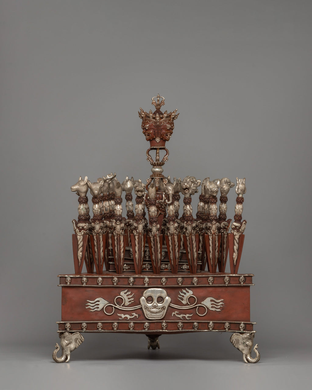 This Tibetan Phurba Collection (Set of 25) is a stunning exhibition of creativity and spiritual importance, evoking centuries of Tibetan culture. Each phurba is skillfully made with a copper body and exquisite silver plating, and it has an antique polish that adds to its ageless charm. The complete set is housed in a finely made box decorated with complex skull designs and symbolic engravings, adding to its ceremonial and aesthetic appeal. With a height of 59.5 cm, a width of 45.5 cm, and a weight of 20.0 kg, this set is an impressive centerpiece for any spiritual practice or collection.