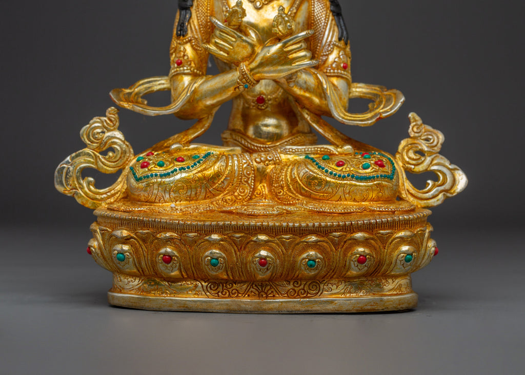 Vajradhara, also known as the Primordial Buddha, represents the highest realization of the enlightened mind—the embodiment of emptiness (śūnyatā) and unshakable wisdom (vajra-jñāna). He is depicted in a serene meditative pose, seated in the padmāsana (lotus posture) atop a moon disc and lotus base, symbolizing purity and spiritual stability. He holds the vajra and bell in his Embracing Mudra (crossed hands): the vajra symbolizes indestructible wisdom, while the bell signifies the vast openness of emptiness. His tranquil expression reflects inner peace and ultimate awareness, while his ushnisha on the top of his head marks his supreme awakening. Adorned with gemstones and elegant ornaments, Vajradhara radiates the timeless essence of the Dharmakaya—the truth body from which all Buddhas arise.