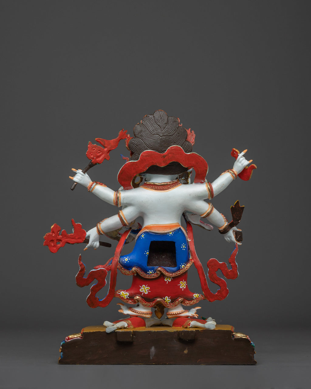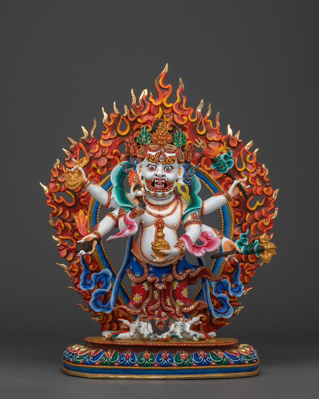 White Mahakala, the Wrathful Manifestation of Compassion, is regarded throughout Tibetan Buddhism as a protector of the Dharma and spiritual practitioners. His function is to clear obstacles, disperse negative energy, and protect those on the path to enlightenment. This skillfully sculpted statue, whether placed in a sacred shrine or meditation room, allows practitioners to invoke his tremendous protection daily.