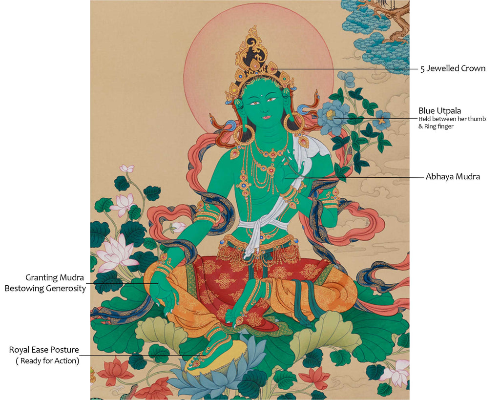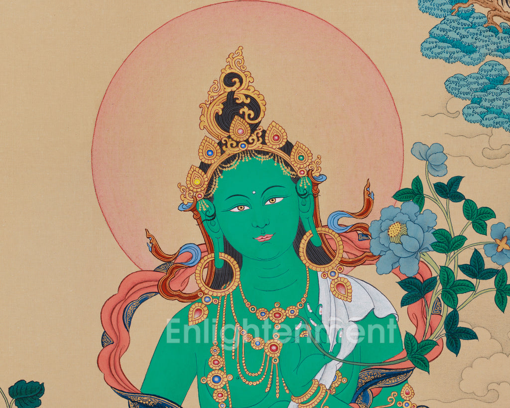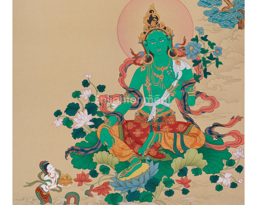 The background of this thangka accentuates Green Tara's commanding presence through a tranquil, symbolic landscape. Gentle clouds serve as the upper backdrop, enveloping her in an aura of serenity. Encircling her are revered elements such as the Nagkanya (snake princess) on the left, signifying the earth’s nurturing strength, and vibrant flowers that denote spiritual development and purity. On the left, bird figures and the moon evoke themes of freedom, serenity, and enlightenment, adding a sense of peace and divine glow to the scene. These emblematic details, in conjunction with Green Tara’s compassionate form, establish a harmonious link between nature and spirituality.