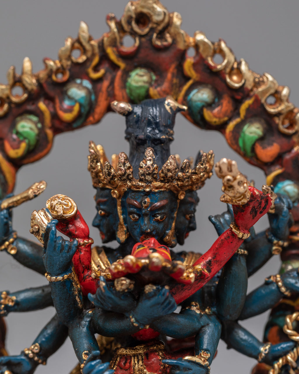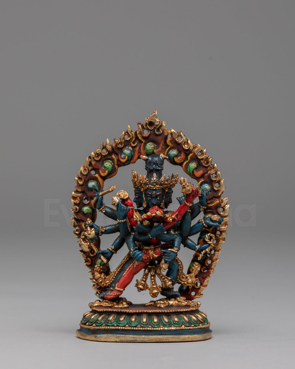 This Protector Icon Chakrasamvara Statue captures the powerful presence of one of Vajrayana Buddhism’s most profound meditational deities. Chakrasamvara symbolizes the union of wisdom and compassion, embodying the transformative energy that guides practitioners toward inner awakening. Sculpted in copper with gold-plated accents and detailed acrylic color work, the statue radiates depth, vibrancy, and sacred intensity.