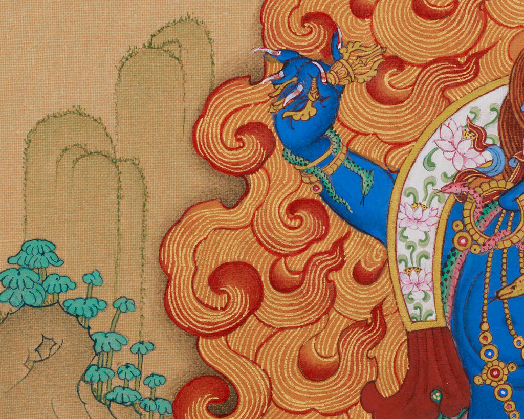 A Protector of Dharma Vajrapani Thangka is hand-painted on high-quality cotton canvas utilizing natural Lhasa stone colors and enhanced with 24K gold. It is fierce, dazzling, and profoundly meaningful. The gold detailing gives a spiritual power, while the mineral tints add an earthy brilliance and timeless depth. This thangka, made in the ancient Karma Gadri style, is significant because Vajrapani symbolizes the unbreakable force that defends the Buddha's teachings and eradicates ignorance at its source.
