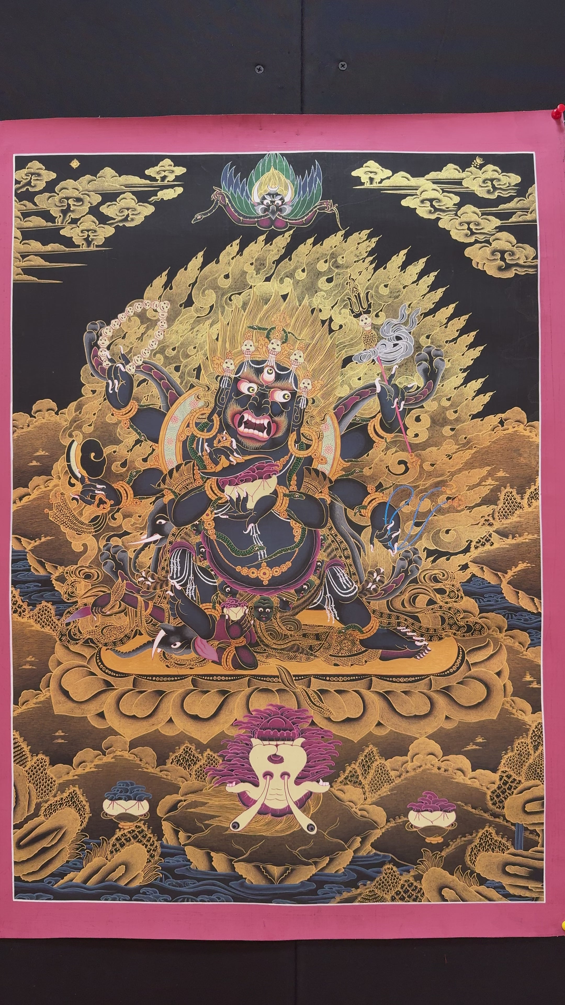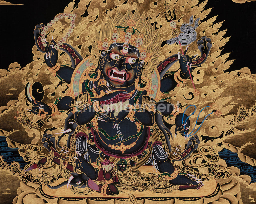 The Protector Six-Armed Mahakala Thangka is a powerful and dynamic artwork, meticulously hand-painted on premium cotton canvas using vivid acrylic colors. The acrylic colors provide bright colors that accentuate Mahakala's furious energy, while the rich textures of the cotton canvas give depth to the minute details. The thangka, which embodies Mahakala's protective power, is painted in the traditional Nepali style. The strength and transformational force of Mahakala, the guardian deity who protects spiritual practitioners from all harm, challenges, and harmful influences, are embodied in this sacred composition.