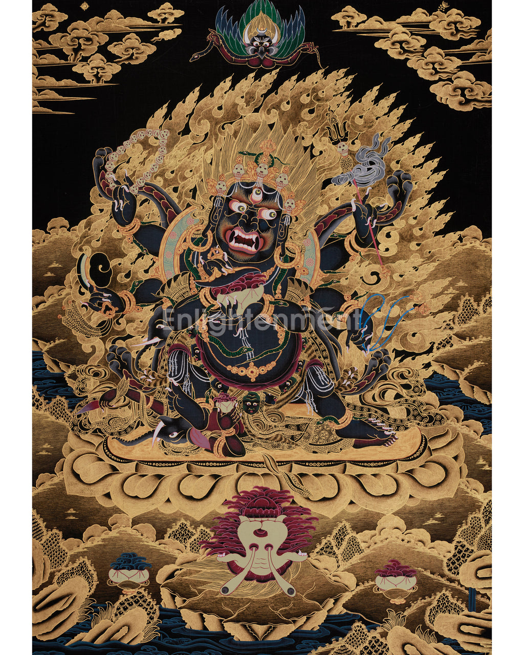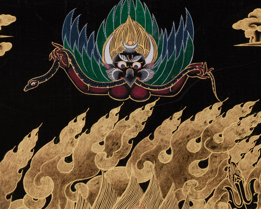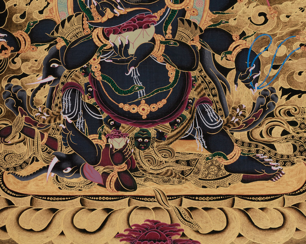 One of the most potent Dharma guardians in Tibetan Buddhism, Six-Armed Mahakala is a furious incarnation of Avalokiteshvara, the Bodhisattva of Compassion. Mahakala, referred to as the "Lord of the Dharma," is responsible for safeguarding the Buddha's teachings and those who follow them. He has the ability to change bad energy into wisdom and protection, as evidenced by his fierce look and angry countenance, protecting people who seek his blessings. Six-Armed Mahakala is portrayed in this thangka in a dynamic, controlling stance with six arms, each of which is holding a different ritual object that represents his strength and ability to defend. He is surrounded by flames of wisdom, which stand for the elimination of impediments and bad forces. The Garuda beneath him highlights how quickly and unstoppably he overcomes obstacles. His skulls and other decorations show his control over illusion and death, while his terrible countenance and ferocious stance communicate his position as a guardian. This thangka is a potent focal point for meditation areas, shrines, and sacred rooms because of its vivid colors and elaborate gold details, which enhance Mahakala's powerful presence.