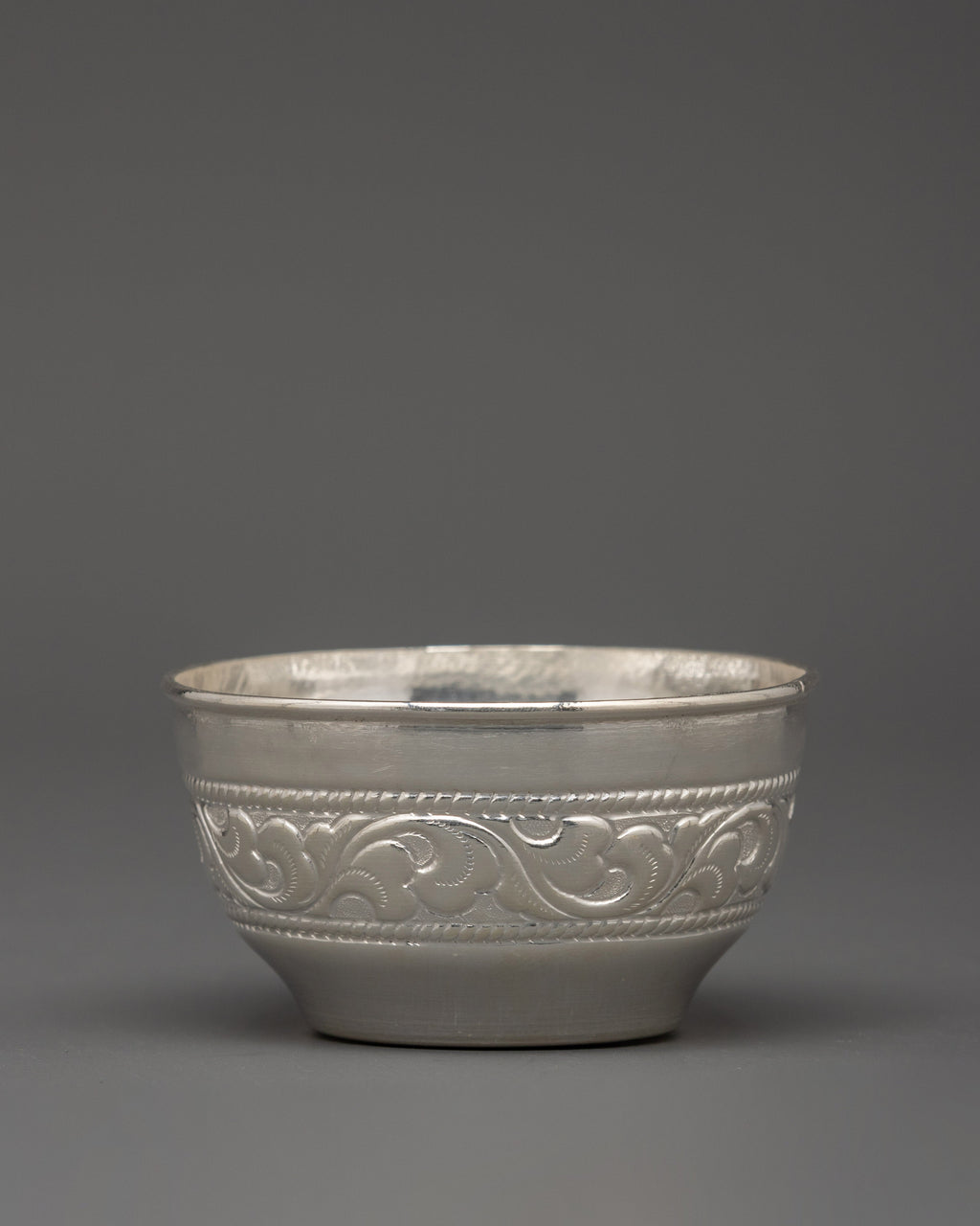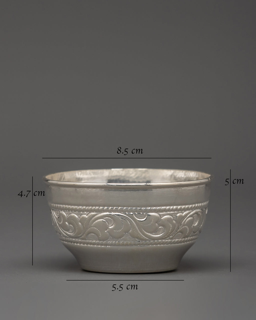 Enhance your spiritual rituals with this Pure Silver Offering Bowl, a finely handcrafted Hindu pooja accessory intended to contain sacred materials during prayers and ceremonies. This exquisite bowl measures 5cm in height, 5.5cm in diameter at the base, and 8.5cm in circumference, making it suitable for presenting water, flowers, rice, or other ceremonial goods for everyday devotion, pujas, and religious holidays. The bowl has a finely engraved floral pattern that represents purity and divine beauty, and it lends a sense of grace and tradition to any home altar or temple area.