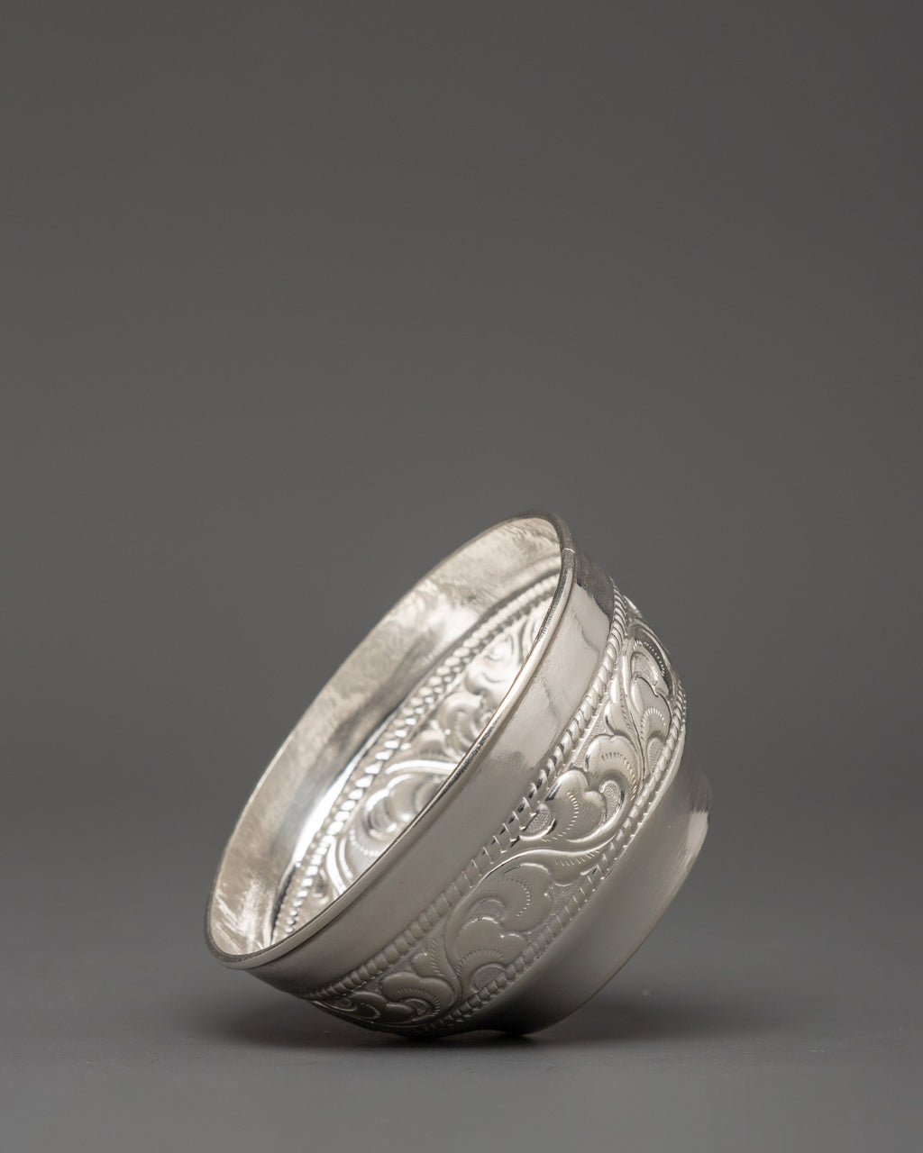 Crafted from pure silver, this sacred ceremonial bowl serves as a utilitarian puja item and a sign of devotion, blessings, and spiritual lineage. Its elegant style and delicate workmanship make it an appropriate addition to your spiritual routines or a considerate present for weddings, housewarmings, and religious occasions. Whether used in Hindu ceremonies, meditation rituals, or simply as a sacred ornamental piece, this silver offering bowl adds a sense of tranquility, tradition, and purity to any event.