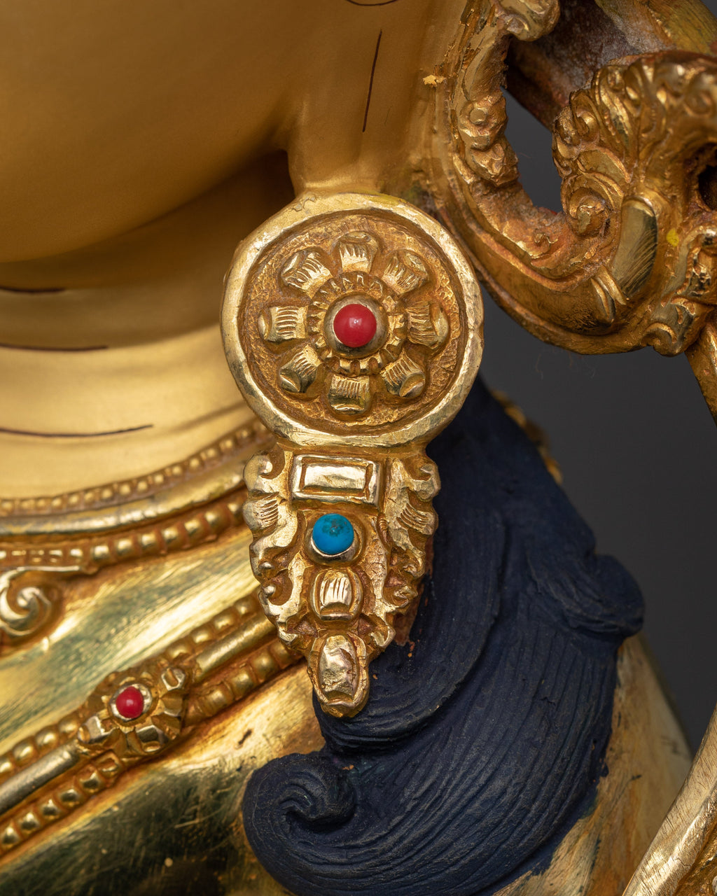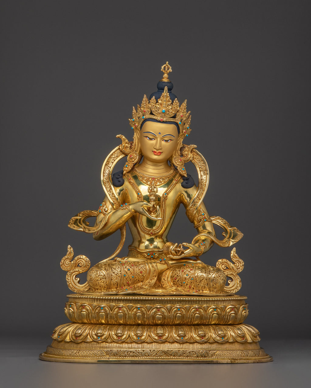 This Buddhist Purification Symbol Vajrasattva Statue stands 21.5”/54.5cm in height and 16.3”/41.5cm at the base and weighs 12.73 kg. It is made of copper, covered with a triple layer of 24K gold gilding, and carved with deeply engraved carvings that produce a magnificent 3D-like effect. This sculpture is handcrafted by expert Nepalese artisans, elegantly symbolizes Himalayan Buddhism's sacred traditions, making it an appropriate addition to altars, meditation places, or sacred collections.