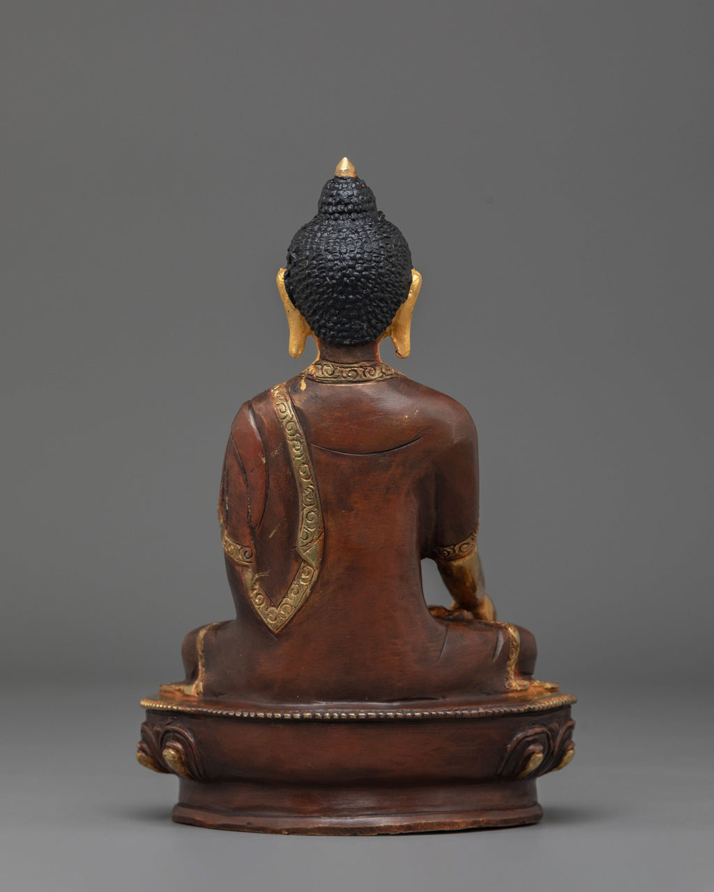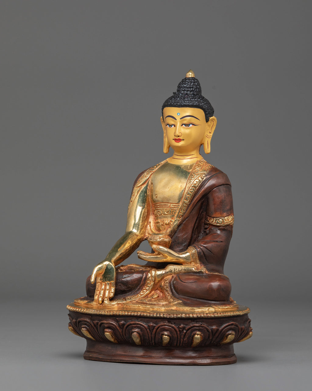 The Ratnasambhava Buddha Statue is a magnificent depiction of one of the five wisdom Buddhas, known for being the personification of generosity and riches. This statue, measuring 21 cm in height and 14.5 cm in width, is made of copper and gold-plated for a spectacular visual effect. Ratnasambhava, the Buddha of Wealth, is seen sitting in an elegant stance, oozing compassion and knowledge. The meticulous detailing of the figure demonstrates the artisans' ability, resulting in a masterwork that may serve as the focus of your spiritual or art collection.