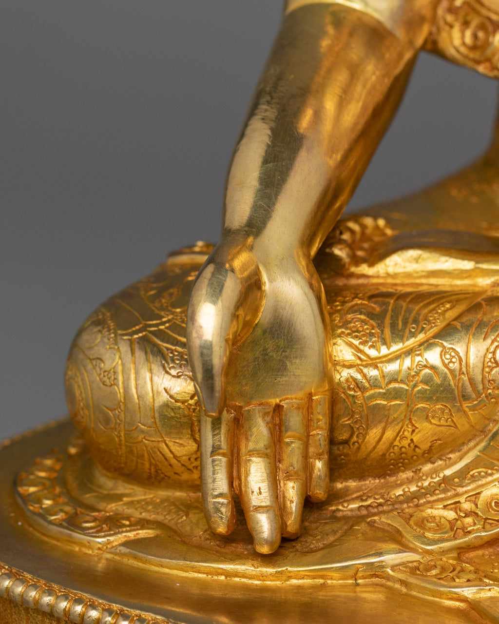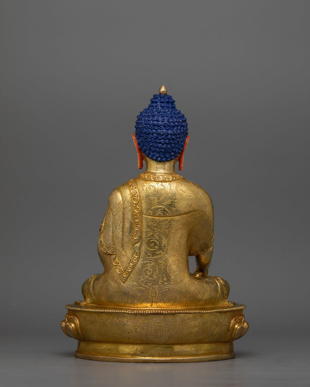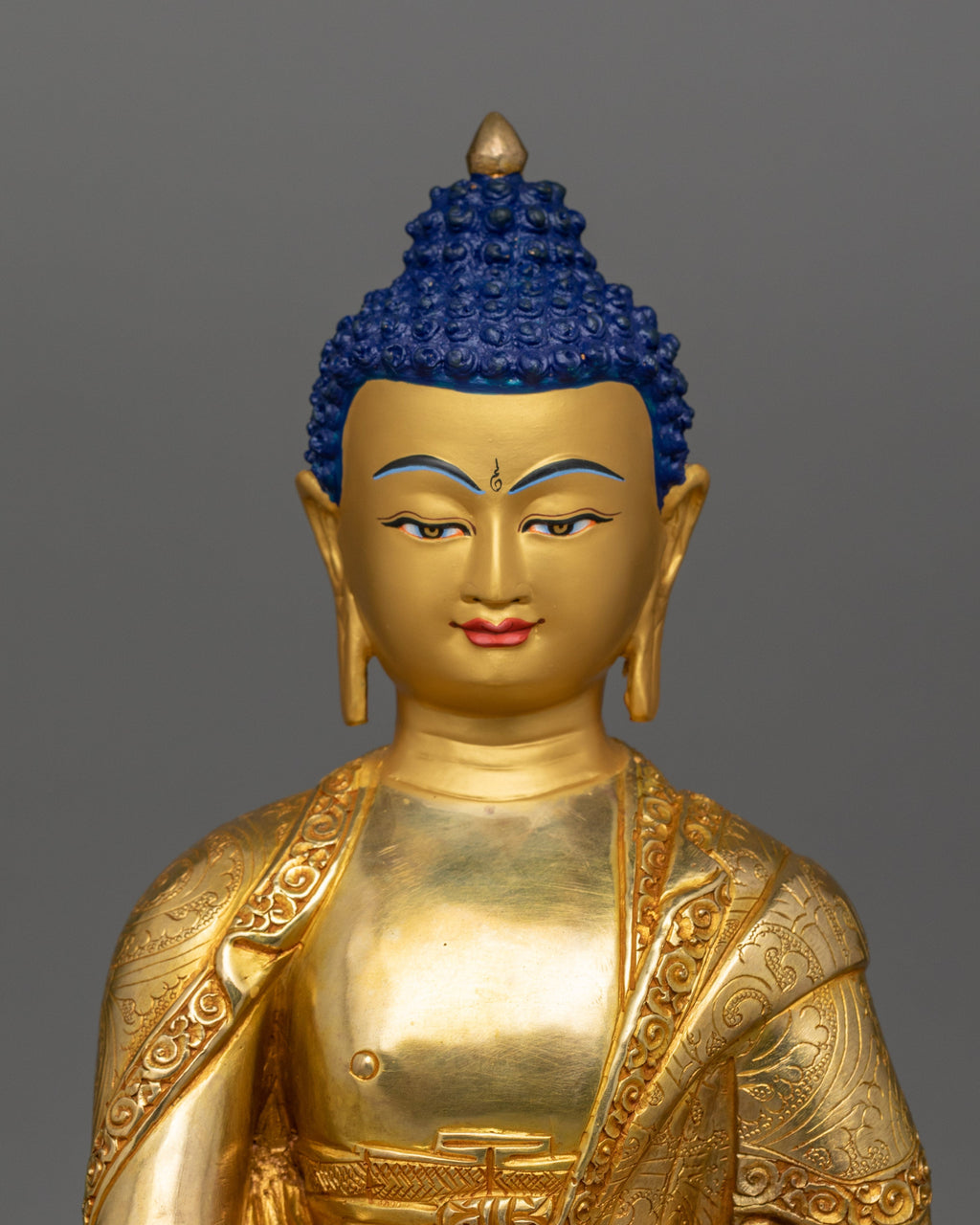 Ratnasambhava is one of the Five Dhyani Buddhas in Vajrayana Buddhism, symbolizing the wisdom of equality and associated with the south. He is often depicted with a Gold Body representing richness and abundance. The statue is Standing at 13 inches (33 cm) in height and has a base width of 9.1 inches (23 cm). It is handcrafted by skilled artisans from Patan, Nepal, using a copper body that is gilded with 24K gold. The face features intricate acrylic painting, and the hair is painted blue, which is a traditional representation in Buddhist art.