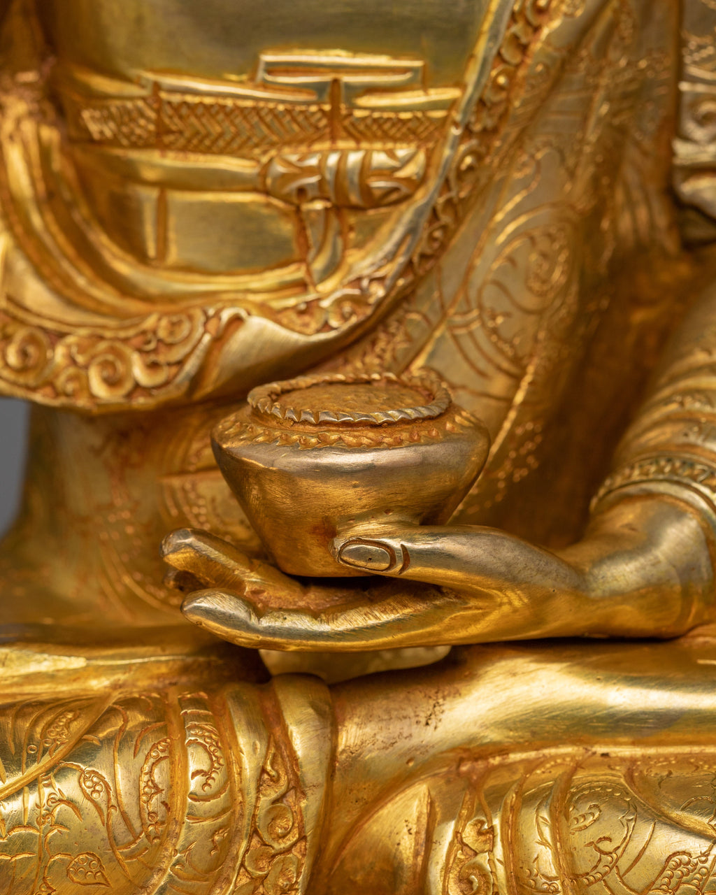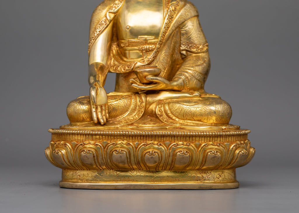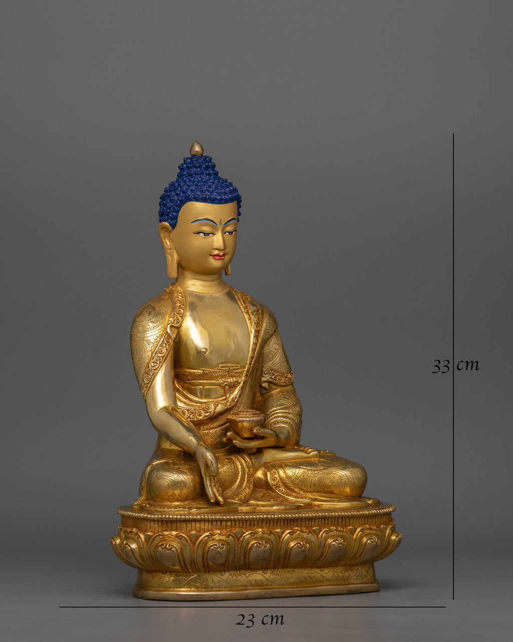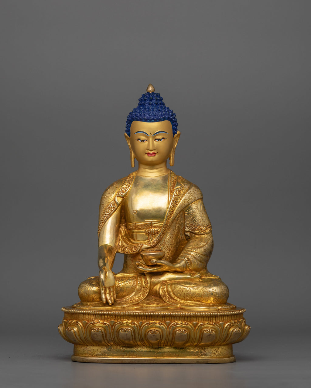 Ratnasambhava is one of the Five Dhyani Buddhas in Vajrayana Buddhism, symbolizing the wisdom of equality and associated with the south. He is often depicted with a Gold Body representing richness and abundance. The statue is Standing at 13 inches (33 cm) in height and has a base width of 9.1 inches (23 cm). It is handcrafted by skilled artisans from Patan, Nepal, using a copper body that is gilded with 24K gold. The face features intricate acrylic painting, and the hair is painted blue, which is a traditional representation in Buddhist art.