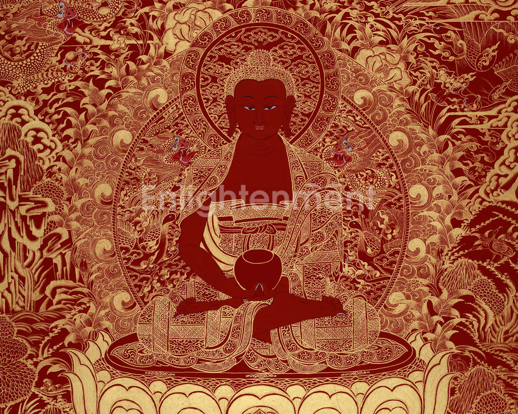 The Red Amida Buddha thangka represents Amitabha, the central figure of the Western Pure Land in Mahayana Buddhism. The Buddha is depicted in a serene state, symbolizing infinite compassion and spiritual liberation. It is painted in gold on a red canvas, while the Buddha's body and facial features are rendered in acrylic colors. The remaining elements, including his elaborate robe, lotus throne, clouds, landscape, and celestial motifs, are intricately created in gold. It enhances visual richness and symbolizes purity, vitality, and the sacred nature of Amitabha’s enlightened realm.