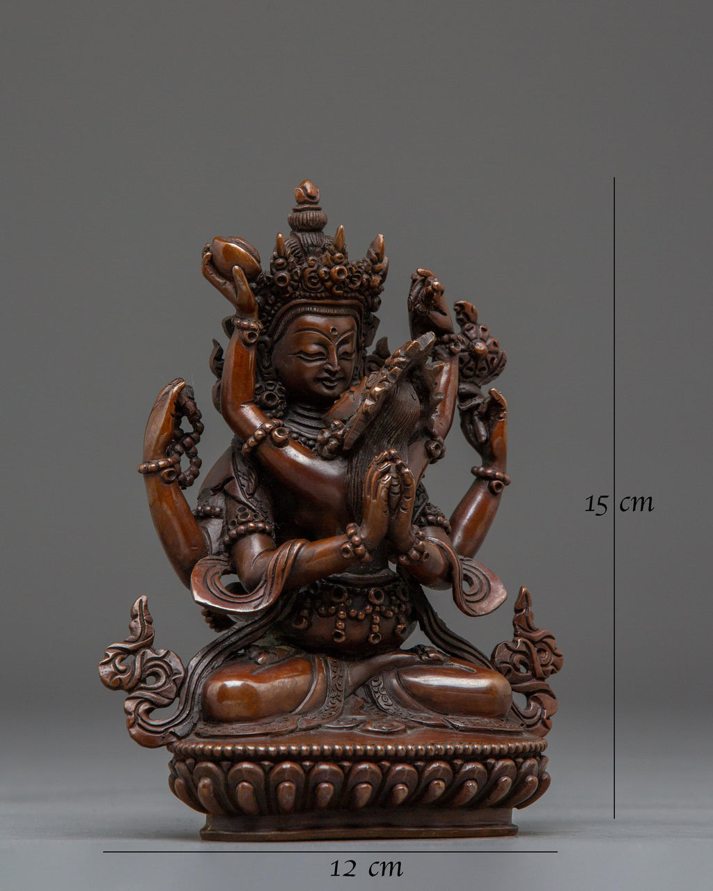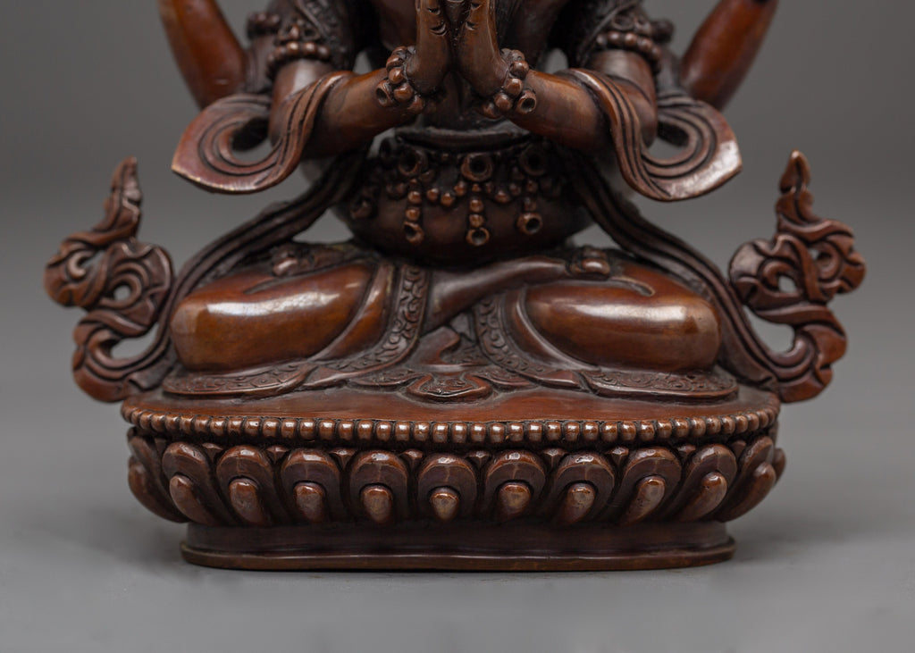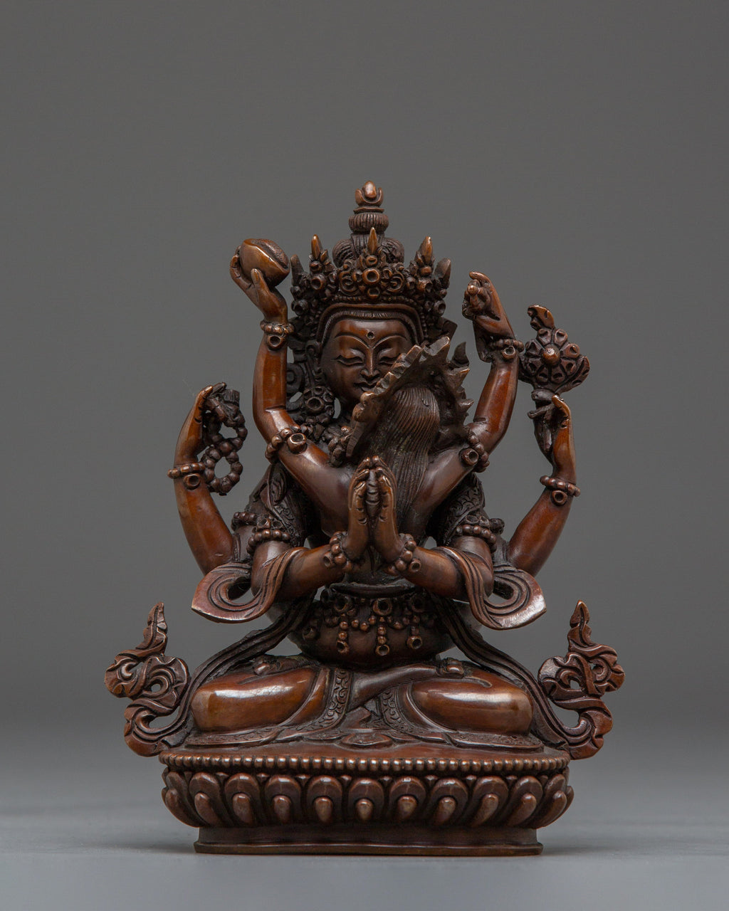 This Red Chenrezig with Vajrayogini Oxidized Statue measures 5.9” (15 cm) in height and 4.7” (12 cm) at the base and weighs 0.84 kg. Crafted from oxidized copper, it showcases traditional Nepali artistry with a rich craft. This statue makes a meaningful addition to meditation spaces, altars, or spiritual collections, symbolizing deep compassion and transformative energy.