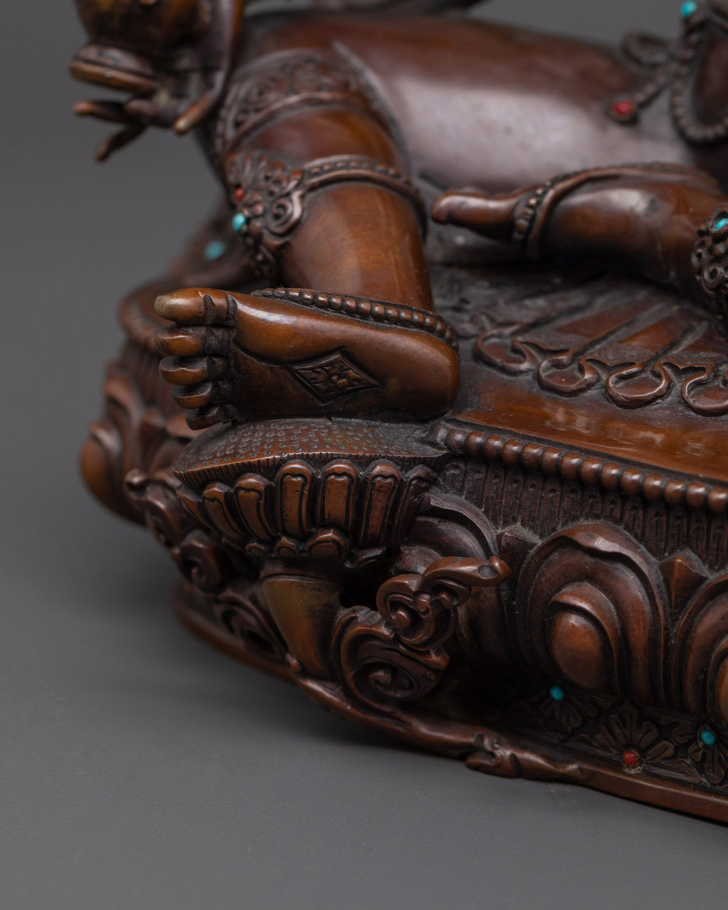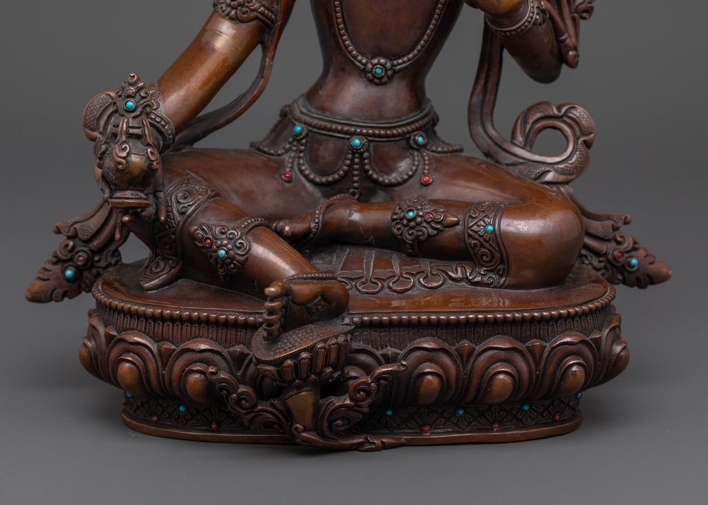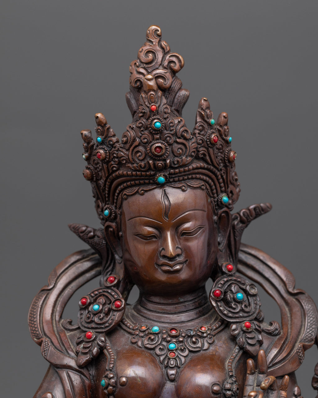 Standing at 12.2 inches in height, Red Tara is depicted seated in a posture of poise and power. Her right hand holds a vase, while her left hand holds a lotus, which has a bow and arrow on top of it. Her expression reflects strength and compassion, embodying her role as a protector and guide.