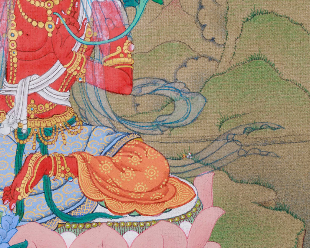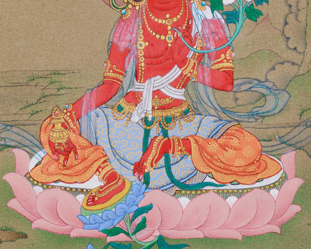 In this thangka, Red Tara, seated gracefully on a blooming lotus throne, radiates confidence, power, and compassion. Her bright red form symbolizes wisdom and strength, while she holds a nectar-filled vase in one hand and a bow with an arrow on a lotus in the other, representing spiritual abundance and enlightened influence. Her golden five-jeweled crown signifies mastery over ignorance, desire, anger, jealousy, and pride. Sitting in a relaxed posture, she is ready to act with compassion. The gold accents on her robes enhance the piece's depth and movement, complemented by a serene landscape that reflects her enlightened realm.
