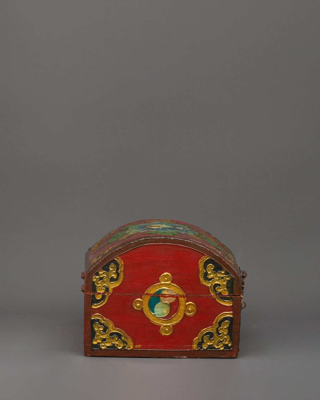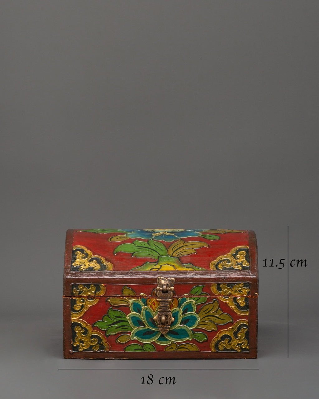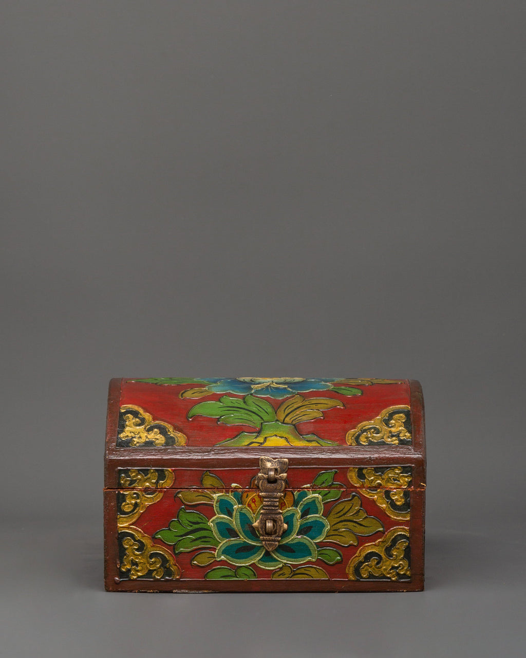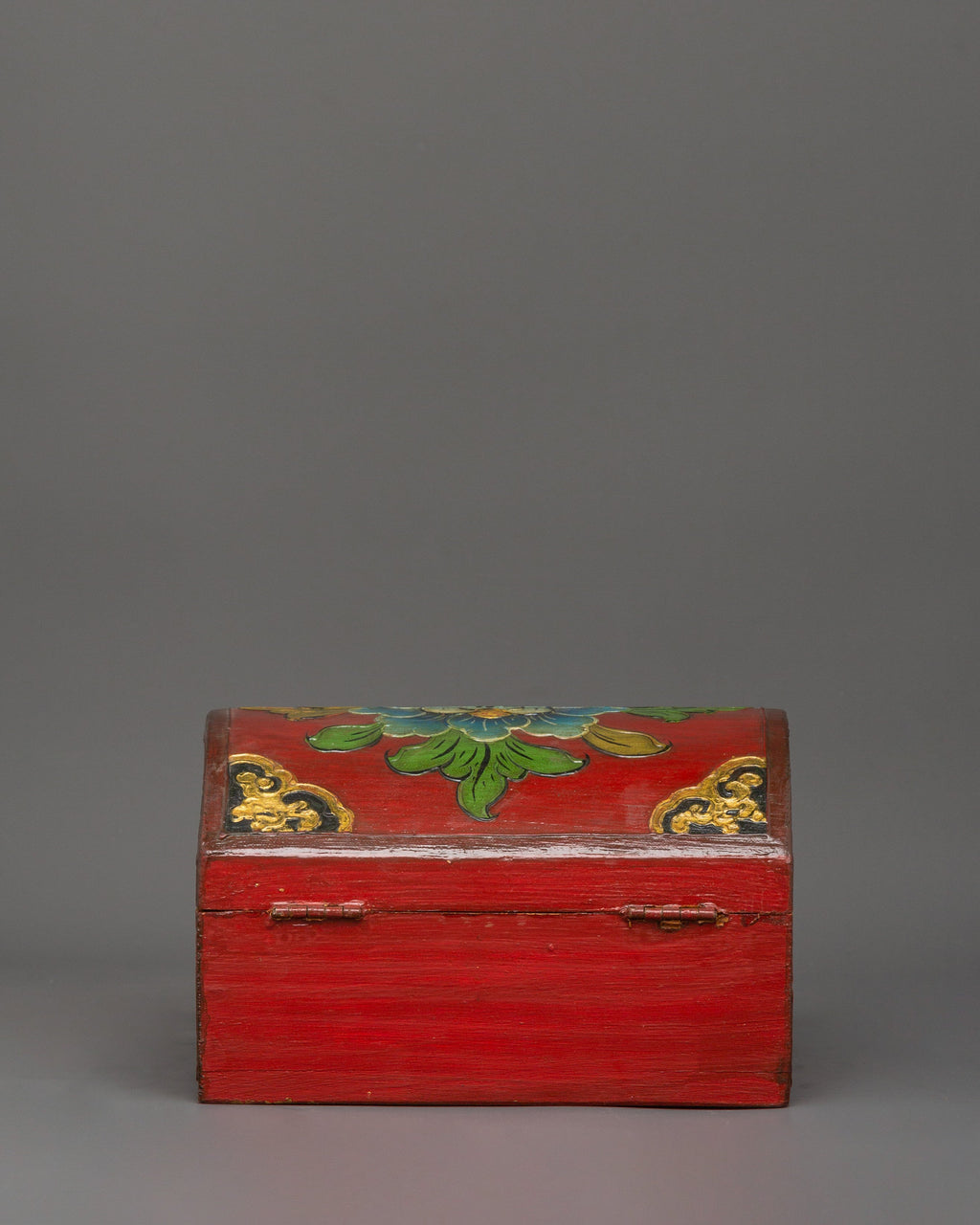 The box is made of wood and hand-finished with effectively coated acrylic paint. It features traditional Tibetan floral patterns enhanced with gold accents. The blue-green lotus in the centerpiece gives depth and tranquility, while the vibrant red background represents life and good fortune. Its authentic, handcrafted look is completed with a strong metal hold that provides protected elimination.