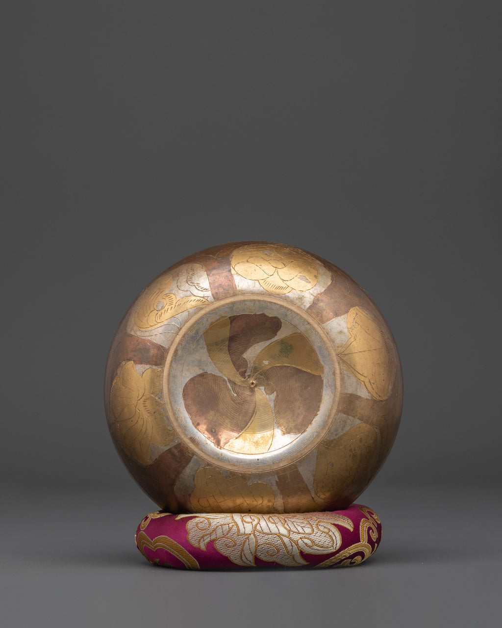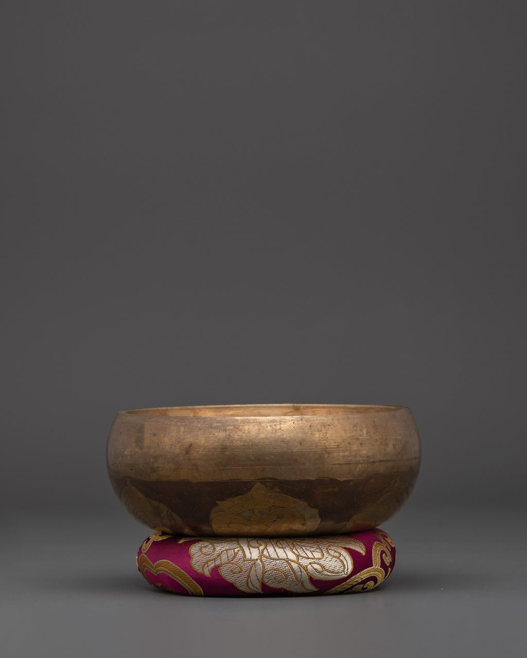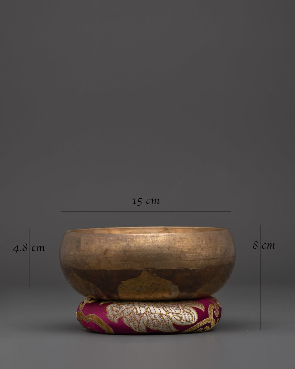 Expertly crafted using traditional Himalayan techniques, this bowl reflects a minimalist yet timeless aesthetic. The five mixed metal composition—typically a blend of copper, tin, zinc, iron, and silver—symbolizes the harmony of the five elements: Earth, Water, Fire, Air, and Space. This blend not only enhances the sound’s depth and clarity but also represents unity, balance, and connection between body, mind, and spirit. The bowl rests on a silk brocade cushion, ensuring stability while amplifying the purity of sound during meditation.