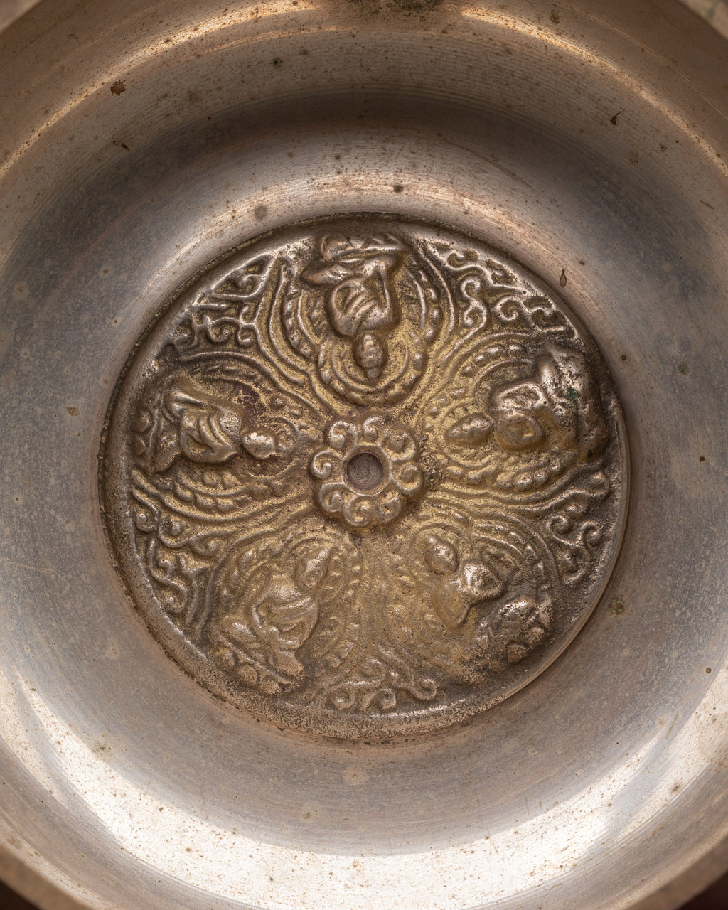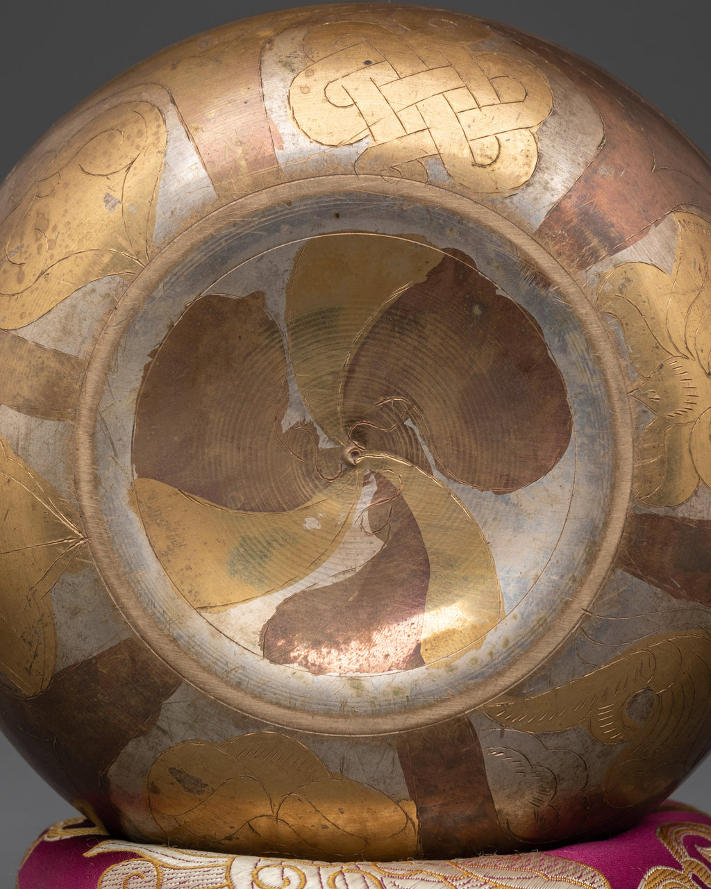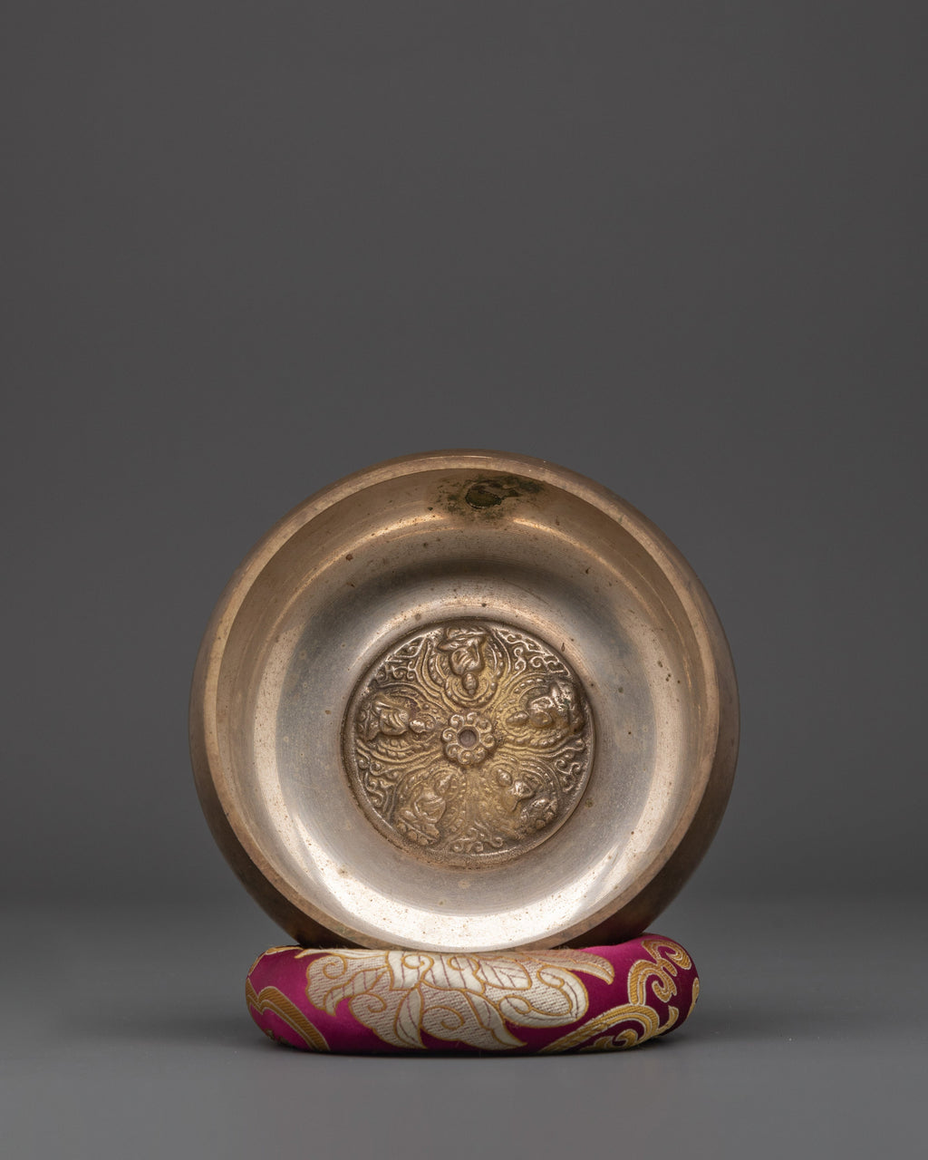 Expertly crafted using traditional Himalayan techniques, this bowl reflects a minimalist yet timeless aesthetic. The five mixed metal composition—typically a blend of copper, tin, zinc, iron, and silver—symbolizes the harmony of the five elements: Earth, Water, Fire, Air, and Space. This blend not only enhances the sound’s depth and clarity but also represents unity, balance, and connection between body, mind, and spirit. The bowl rests on a silk brocade cushion, ensuring stability while amplifying the purity of sound during meditation.