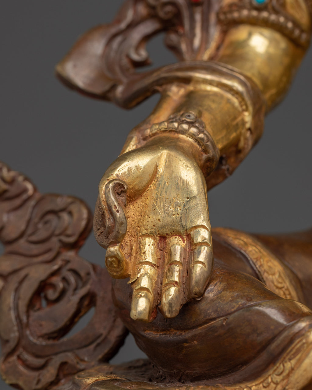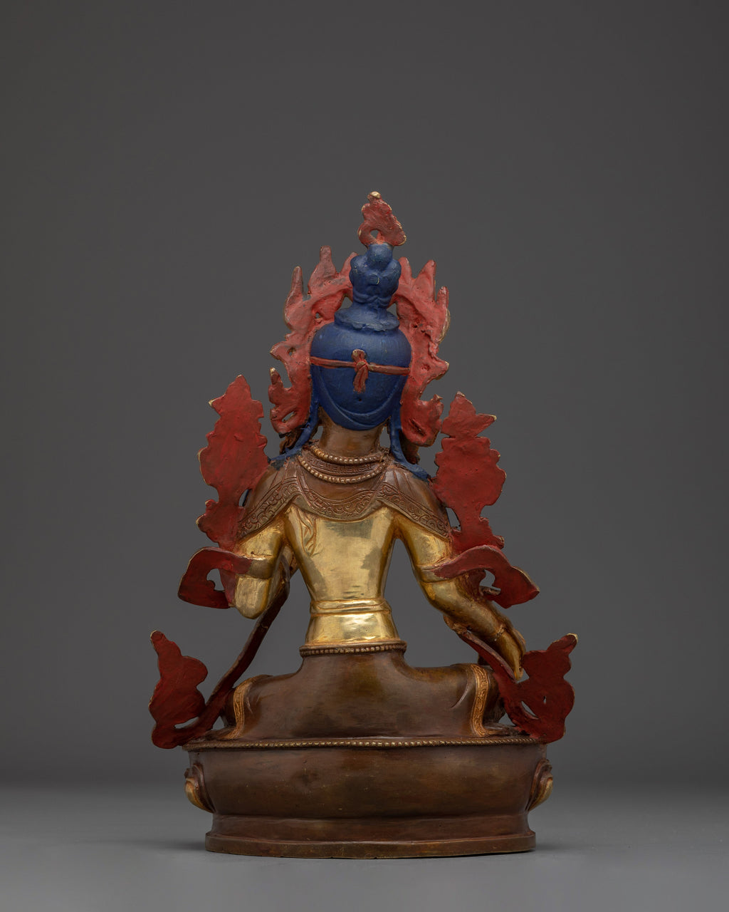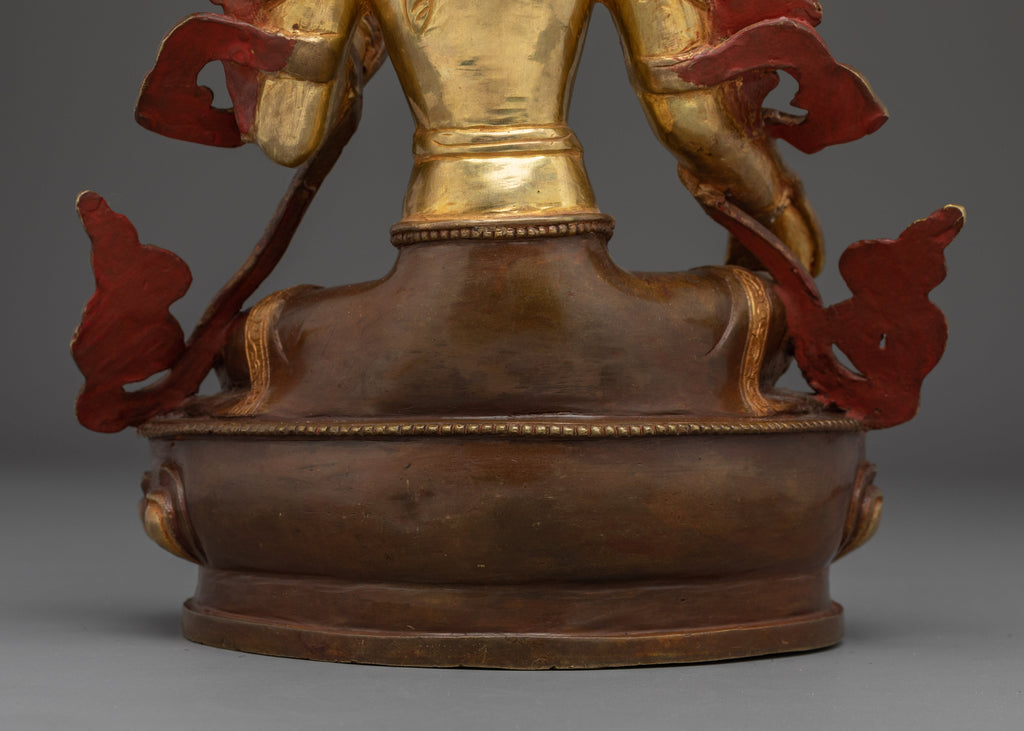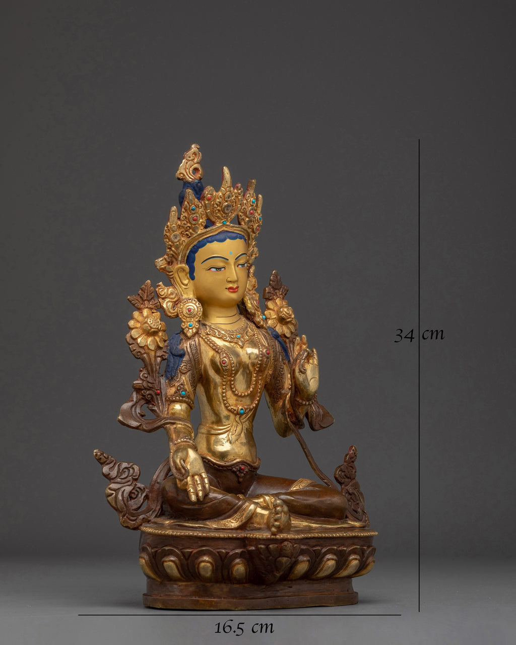 The religious art of Green Tara is crafted from copper and adorned with 24K gold gilding, complemented by intricate gold and acrylic paintings. Measuring 9.6”/34cm in height and 6.5”/16.5cm at the base, it weighs 1.48 kg. This statue radiates serene beauty and spiritual presence, making it a meaningful addition to any altar, meditation space, or sacred art collection.
