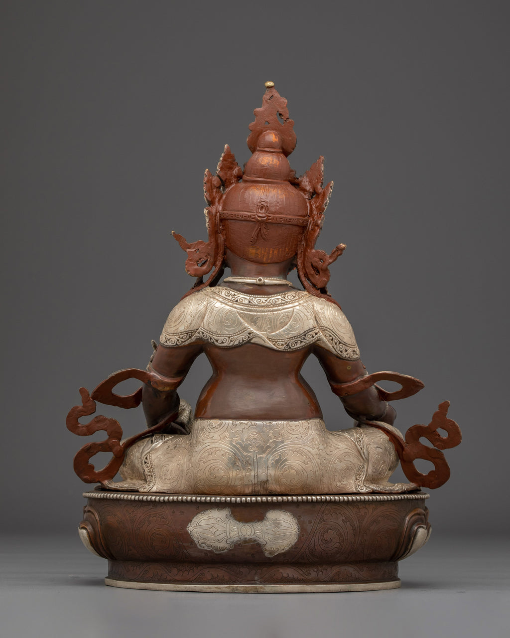 The Religious Artwork of Dzambhala measures 13.6 inches (34.5 cm) in height and 11.2 inches (28.5 cm) at the base. It weighs 4.63 kg and is crafted with a copper body featuring silver plating, representing the spiritual creativity of Himalayan Buddhism, making it a powerful addition to altars, meditation places, or sacred collections.