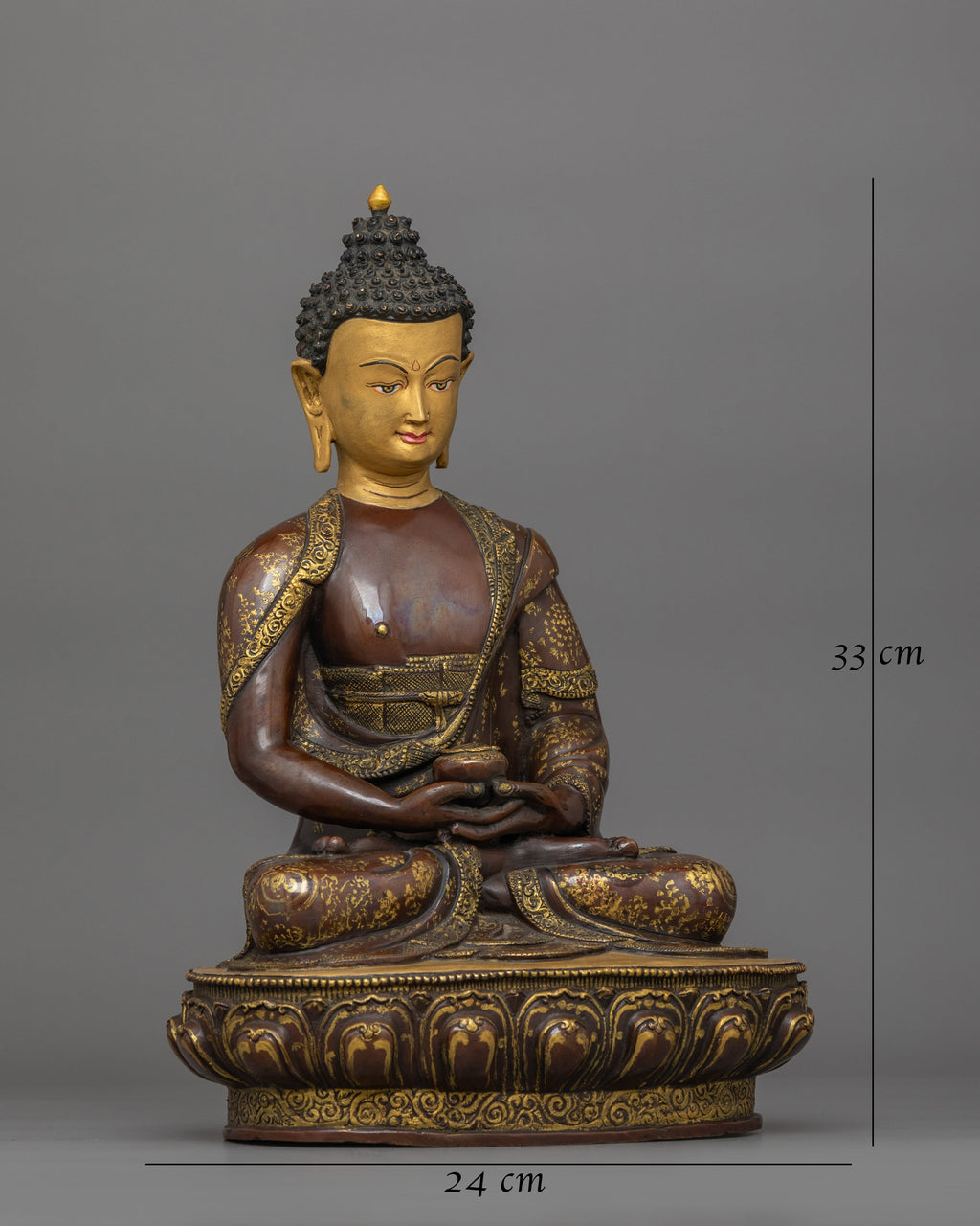 Religious Buddha Amitabha statue is a meaningful addition to any spiritual or meditation environment. Amitabha Buddha represents unlimited light and compassion which motivates practitioners and followers to find peace and enlightenment. This 13" figure, made of oxidized copper and embellished with gold and acrylic paintings, makes an excellent centerpiece for altars, shrines, or home decor. Its tranquil design adds a sense of calm and spiritual significance to any sacred area.