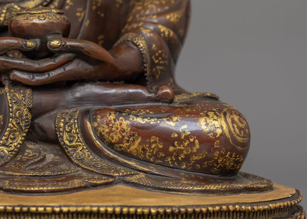 Amitabha is shown in a tranquil sitting stance, holding an alms bowl in his lap, symbolizing renunciation and the simplicity of the enlightened life. His peaceful countenance represents the knowledge and compassion he bestows on individuals seeking rebirth in his Pure Land; Amitabha's dedication to assisting all creatures in achieving spiritual awareness and freedom is demonstrated by this gesture.